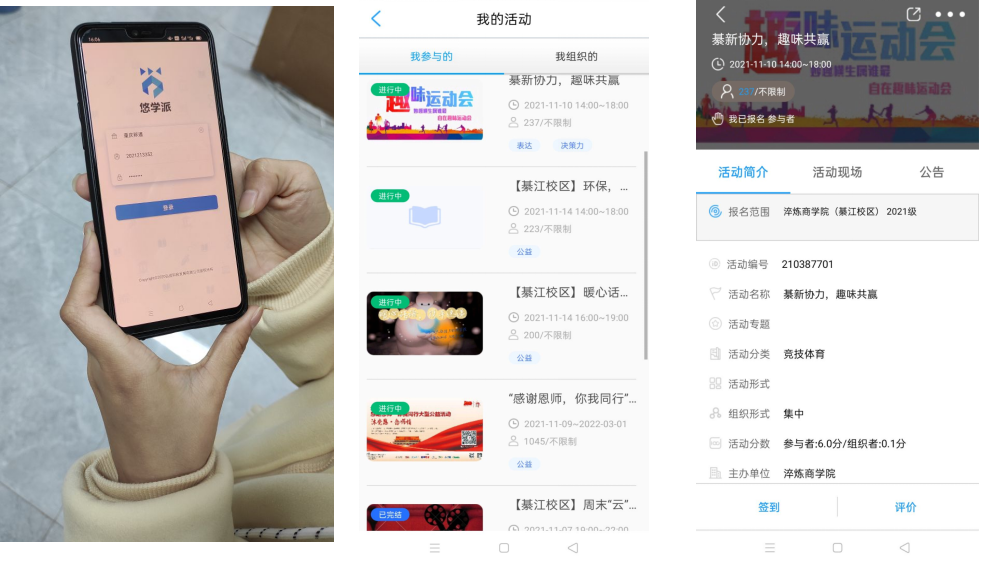 11月8日,我院完满教育活动正式拉开帷幕。从11月8日到14日,校园社团活动“新生班级辩论赛”、“班级合照大赛”,竞技体育活动“新生趣味运动会”,艺术修养与实践活动“合唱比赛”,志愿者服务活动“最热公益班团支队”均陆续在悠学派上发布。对于这周已发布的活动,同学们都能积极参与并认真完成。此外,通过这一周时间的适应,同学们也真正地掌握了悠学派的正确使用,课余生活得到极大地丰富,管理、沟通、合作等方面的综合能力得到明显提高,同学们都感觉自己的大学生活变得丰富多彩了。
