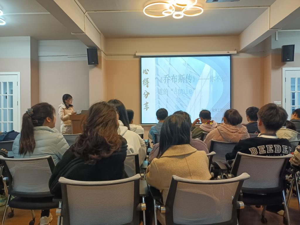 第二位分享的是来自大数据与软件学院2021级软件工程1班的龚夏云同学,她分享的主题是“乔布斯传——你不知道的‘Apple’”,在她的分享过程中,同学们了解到了一颗名为乔布斯的巨星从升起再到陨落的过程。同学们纷纷对乔布斯的逝去感到遗憾,并且决定要认真学习科学文化知识,争取成为下一个“乔布斯”!
