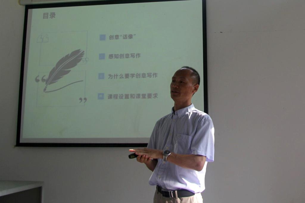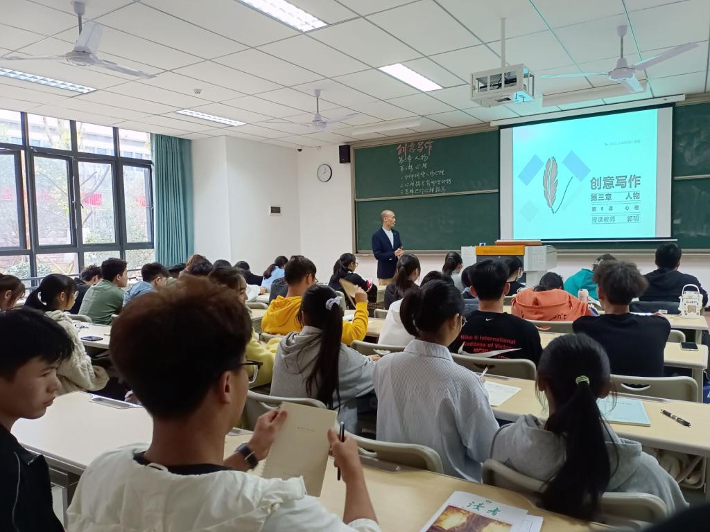谈到创意写作,当然要从我们的创意写作老师郭明谈起。他当过兵,当过记者,也是一名作家,还演过西游记。留着一副光头的他,看上去面容严肃,却内心柔软和包容,每每到了同学们分享互动的时候他总会走过去微微侧身倾听,遇到动情之处他眼眶里就会跟着故事情节闪着泪花,若有同学讲小话则会轻轻地敲敲他的桌子,真是一个有趣的灵魂。对了,仅他丰富的人生阅历就是一本读不尽的书,让我们收获了不一样的课堂。