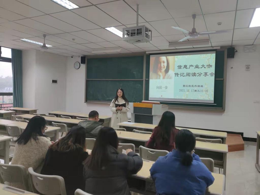 2021年11月17日星期三下午4点整,由重庆移通学院綦江校区外语组举办的“信息产业大咖传记阅读分享会”在仁者楼308教室火热进行。綦江校区外语组教学组组长朱陶、学院督导黄重以及教学组伍世艳、朱英、龚思月、蒋娜等多位老师参加了此次阅读分享会。