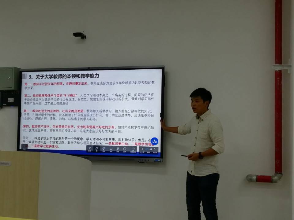 最后,郭老师在授课经验分享方面,以“大学教师应该完成四件事”为引入点,分享了十余年来日积月累的教学经验与技能技巧,深度诠释了课堂教学与课外实践、教师本领和教学能力间的联系,引导新进教师要做有阅历之人、有情感之人、有技巧之人、有特色之人。
