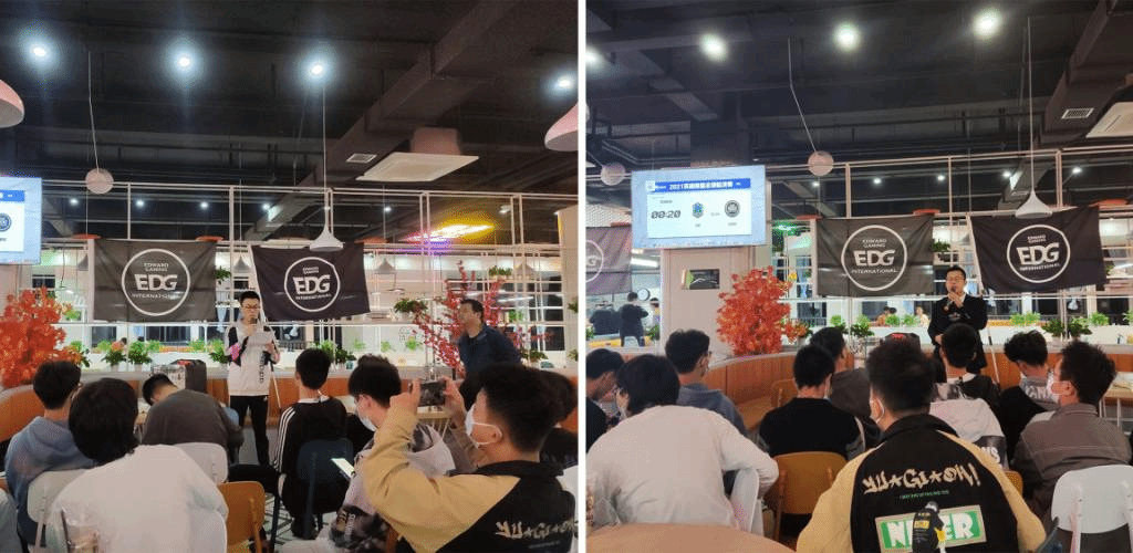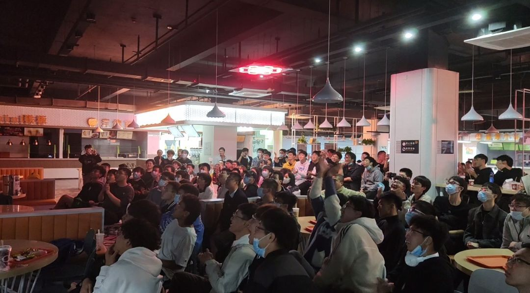 从无到有,是EDG尘封的突破;从0到1,同样是綦江校区GFD电竞社的沉淀。这是电竞社成立以来第一次开展的线下观影活动,趁着LOLs11世界总决赛的热潮,一群热爱电子竞技的同学聚集在了一起,成为第二个相对固定的团队。活动伊始,社团发起人艾晨曦与食堂负责人分别发言对本次比赛及观影活动送上了祝福。随着时间的推移,战况也越来越激烈,同学们的热情彻底被点燃,让欢呼声充满了食堂。