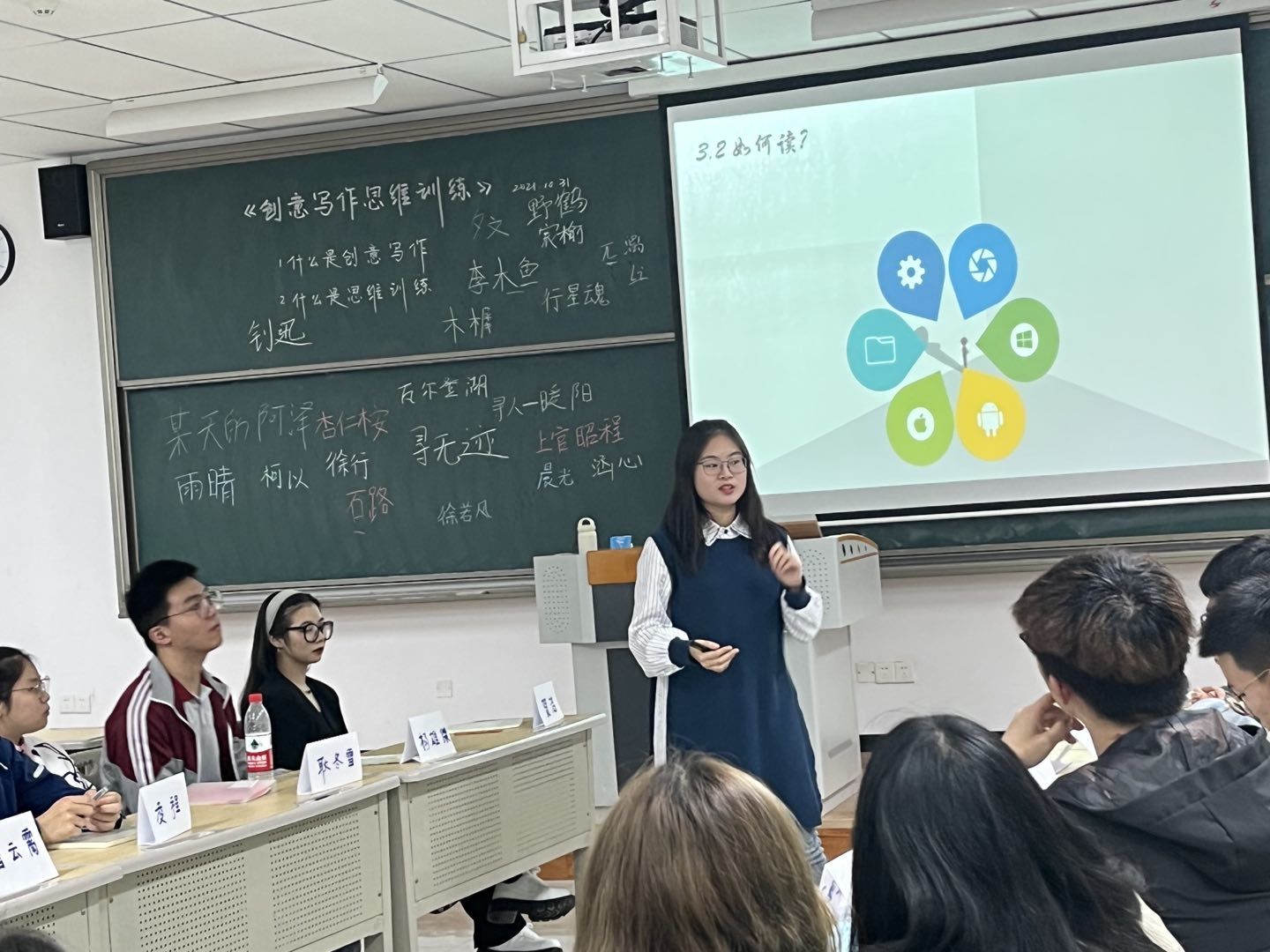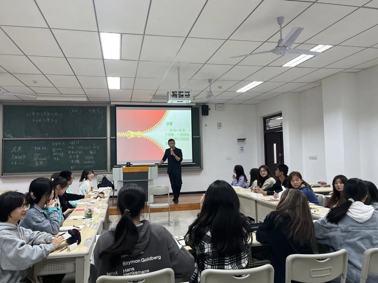 一张张有趣的PPT引领我们走进《创意阅读》的世界,李慧文老师带给我们的惊喜接连不断。万圣节版特制点名游戏开始,我们分享喜爱的书籍,分享阅读的心得体会,我们有过关于读书是否需要读完一本争论,也有过卡夫卡式转折接龙的颠覆想象。阅读的兴趣也在谈笑间悄然生长。欢声笑语贯穿了课堂的始终,明灯下是思绪的碰撞,想象的点点星光汇成了《创意写作思维训练》与《创意阅读》的宇宙。
