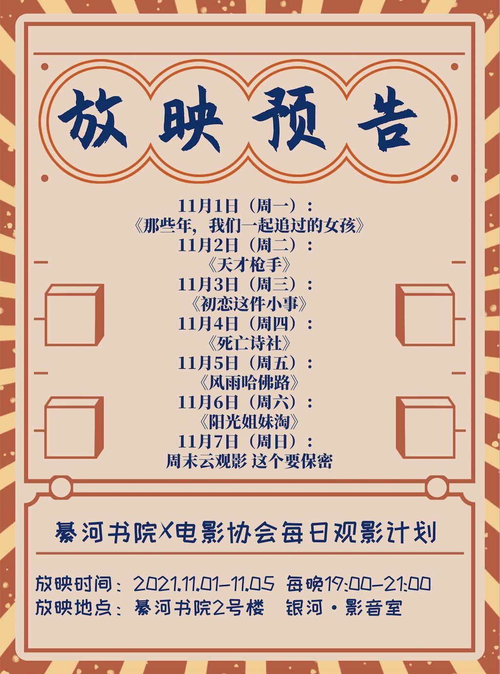 关于每日放映计划:綦河书院X电影协会将于每晚19:00-21:00在银河·影音室放映经典电影。青春校园、灾难片、冬日影单……每周电影主题不同,根据同学们的自主意愿票选出当周观看电影进行播放。