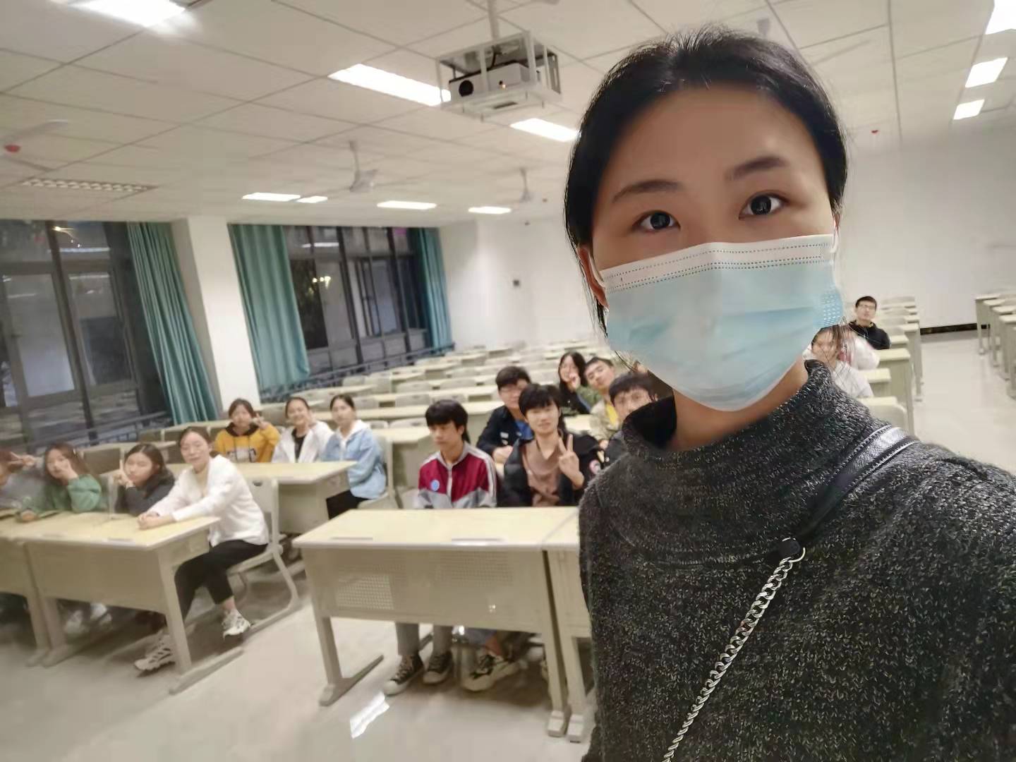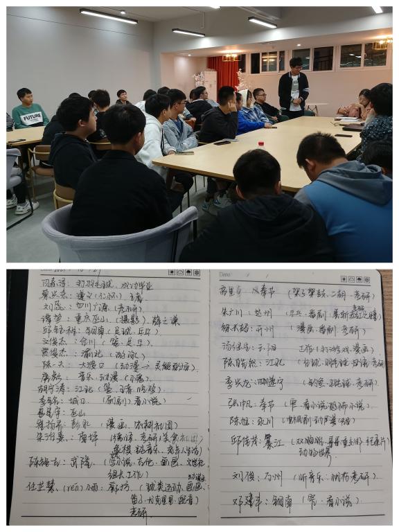 通识教学部冯婷老师说这次见面会主要围绕自我介绍、兴趣爱好分享和未来方向说明三方面展开,在学生做自我介绍,自己依次在笔记本上对每一个同学的名字、家乡、兴趣爱好、未来规划等信息做了记录,同学们兴趣爱好都很广泛。对于未来的人生规划,想要考研的同学占比很大。会后要求每个学生给自己发一张寸照,方便自己快速记住学生。