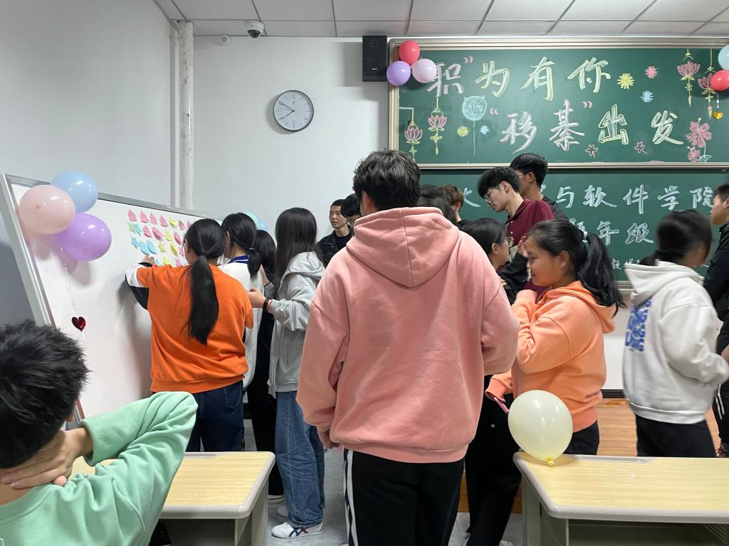 本次主题年级会还为现场同学设置了“心愿墙”的环节,每位同学可以在便利贴上写下对自己的大学祝福和职业规划,一张张心愿单粘贴到“心愿墙”上,就像五彩斑斓的梦,从这学期、从现在就启航出发,带着同学们的心愿奔赴远方。