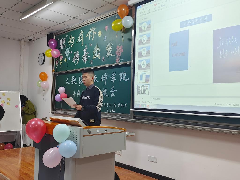 在分享环节,每个班都有同学代表走上讲台,分享他们的职业规划,展示自己大学四年和未来就业的认识。数据科学与大数据技术4班的张骏同学在结尾时与同学们分享,“你要砥砺前行,抛开别人的嘲讽,逆风徘徊,找到并抓住每一次机会,回到舞台,回到自己的战场,伴着众人的猜忌,撒开声喉,这一次,就这一次,放声将努力与反驳抛向夜空,在雷鸣般的掌声下潇洒落幕。”