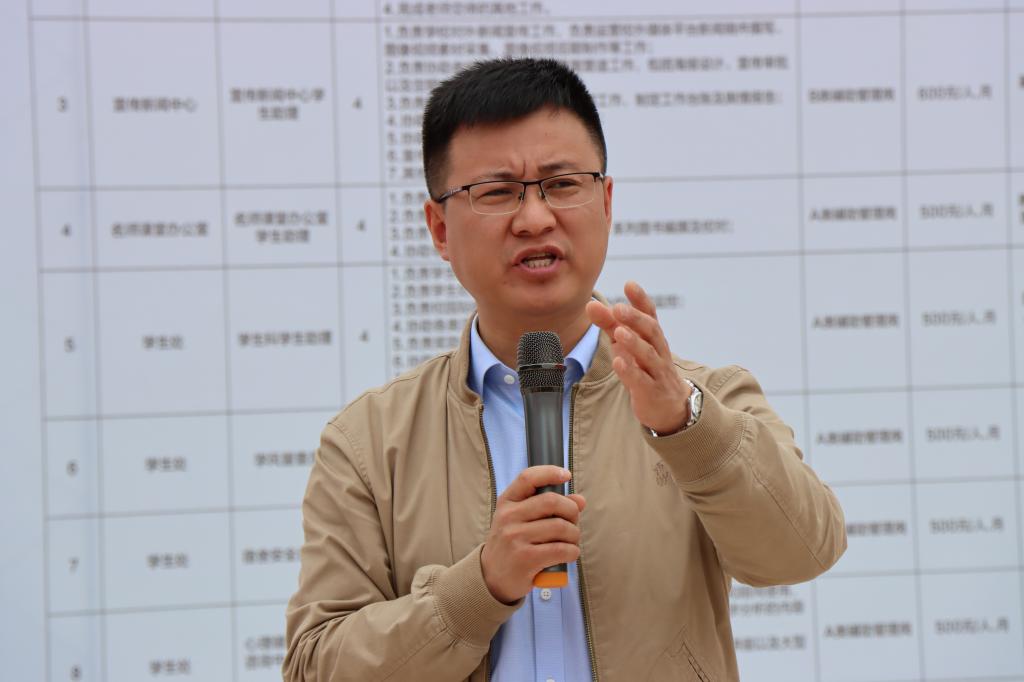 双选会启动仪式上,綦江校区学生处副处长梁少锋老师针对本次双选会岗位情况、面试流程及学校搭建起助学实践平台的目的意义、对同学们的培养内容等做了详细介绍,并鼓励同学们爱岗敬业,在学校提供的平台上锻炼自我、提升自我,勇争“勤工先进个人”。学生处力争将“双选会”启动和各项准备工作做得更加充分、更加细致。会前对校区岗位设置、申报流程、招聘模式、薪酬待遇等进行了全面梳理,并制作了宣传喷绘和海报,学生现场进行简历投递,排队面试。岗位指导老师和应聘学生围绕工作内容、工作时间、招聘要求、培养计划等展开了详细的交流。