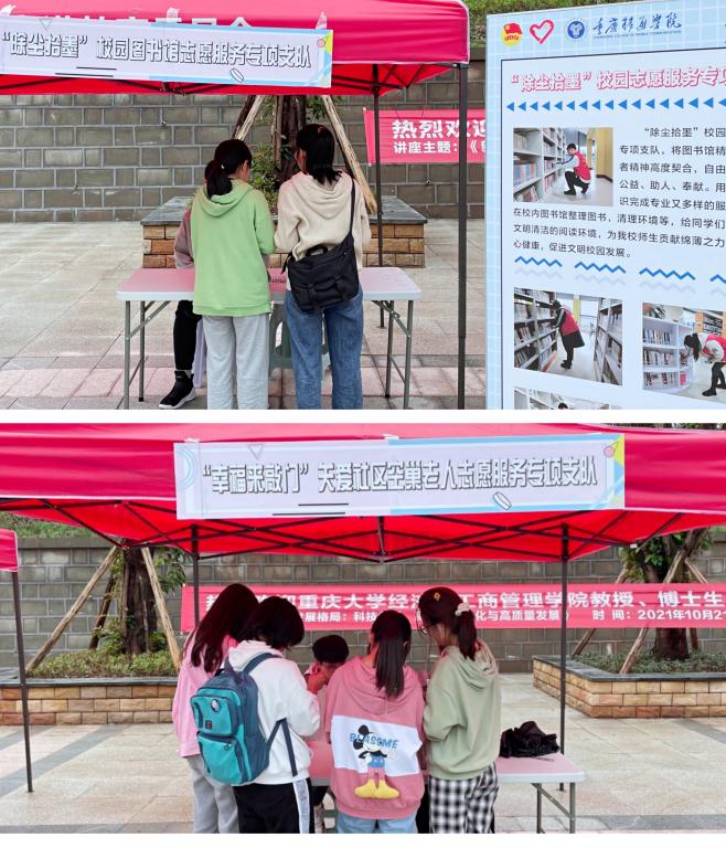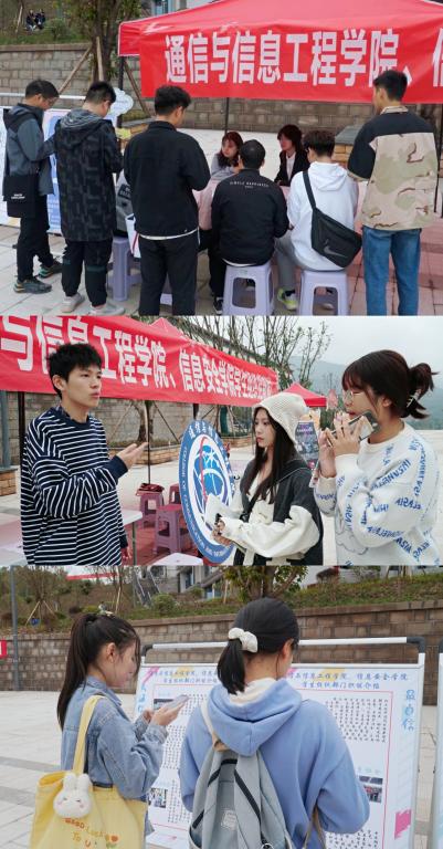 10月18日9点40,当第二节课的铃声响起,图书馆前广场陆陆续续热闹起来,一顶顶红色的帐篷旁围满了学生。在那里,通信、信安学院学生组织招新正火热进行中。