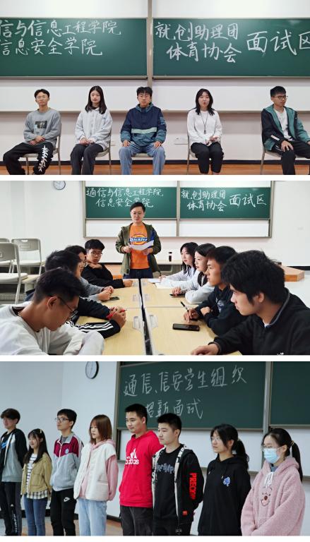 面试环节,学院进行了初筛,初试和复试。面试现场,候场区的同学们有序地签到,然后在候场区静静地等待接下来的面试考核。可以看到有些同学表情镇定,为了让自己达到最佳面试状态;有的同学面带微笑,仿佛对这次面试充满信心;还有的同学拿起手机翻看自己早已准备好的面试稿,只为将最好的一面展示出来。