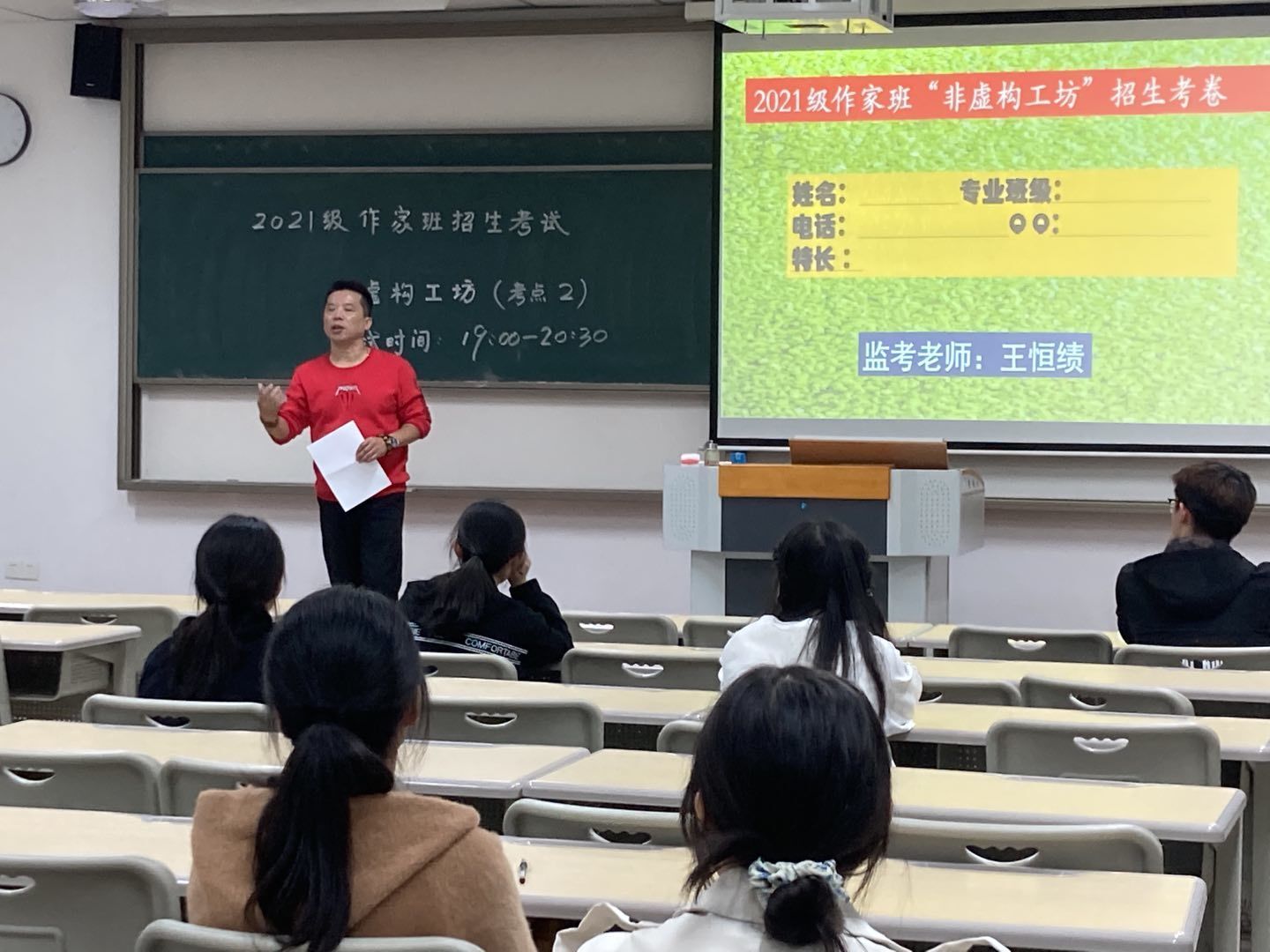 晚上七点,笔试正式开始,各个教室已经坐满了来此考试的学生,王恒绩老师穿着大红毛衣,站在非虚构工坊的考场,对学生宣讲考场规则。