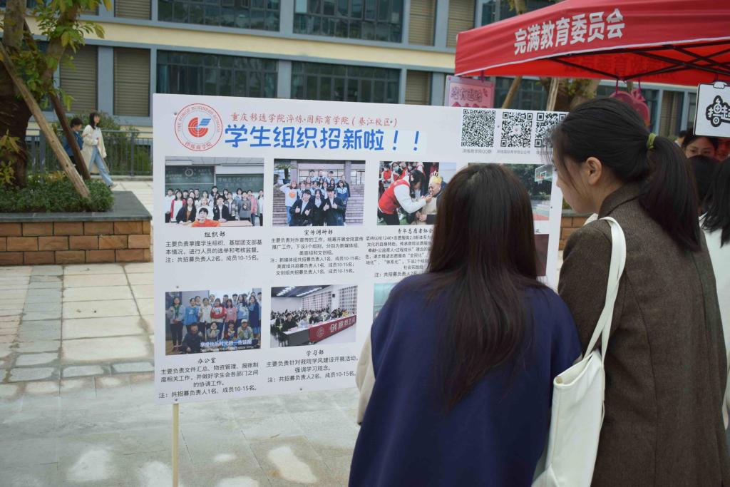 为培养广大商院学子的社会活动能力、提高个人素质,本着贯彻我校完满教育体系的原则,淬炼·国际商学院綦江校区学生组织于2021年10月18日-19日在图书馆广场上积极开展招新工作,同时设有九大部门供同学们选择。
