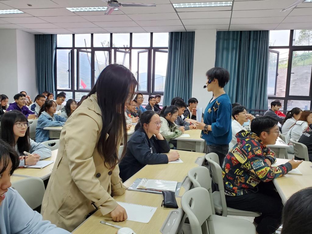 “我很自豪我们重庆移通学院有那么多好老师,王恒绩老师用炸裂的表演和风趣的讲课方式向我们巧妙地展现了文学语言与说学逗唱的隐秘联系,为我们带来了一场精神盛宴。”工商管理15班的张曼同学如是说。