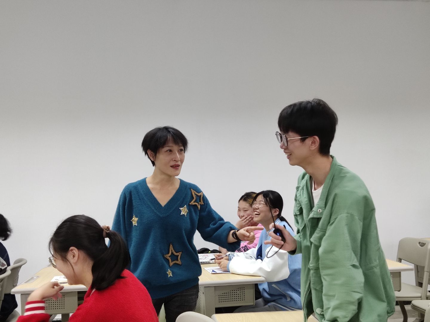 四个学时的体验课,王老师设计巧妙,从方言在文学中的应用到《红楼梦》中王熙凤出场的经典描写,从阿Q对吴妈说“我要和你困觉”的粗犷直接到胡兰成写给张爱玲情书的勾魂撩人,从苏东坡《江城子·乙卯正月二十日夜记梦》悼亡诗词的深婉执着到周杰祭母悼亡诗的朴素锥心,从《康熙王朝》中的经典台词到传统评书《八扇屏》之《莽撞人》的经典台词,王老师适时切入,精彩变换,或引导学生现场以小剧演绎,或自己亲自给同学展演示范,整个课堂响起了80多次掌声。