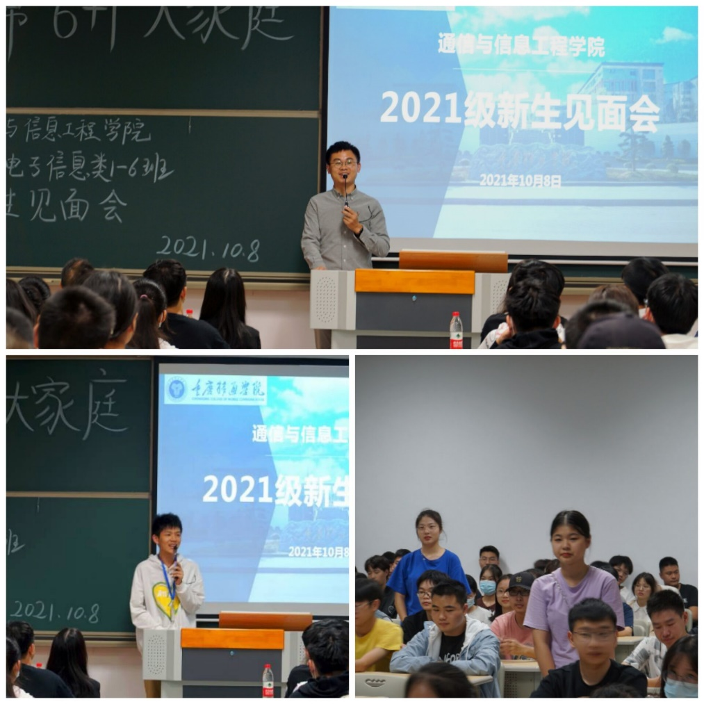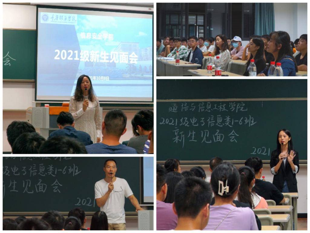 最美不过青春年华,最好不过与你相遇。经过老师和志愿者们紧锣密鼓的准备,2021年10月7日、8日在重庆移通学院綦江校区这片热土迎来了一批新鲜血液,他们带着活力朝气与满满的期待踏入这片即将逐梦扬帆的大学校园。凉爽的秋风徐徐拉开了2021级新生开学的序幕,为了让新生们能尽快消减初入校园的陌生和羞涩,让同学们对学校和学院有初步了解,通信与信息工程学院于2021年10月8日和10月9日在勇者楼202举行了四场新生见面会,通信与信息工程学院李文娟院长、王国树副院长、何燕副院长、全体辅导员老师和班导师们全程参与了此次新生见面会。