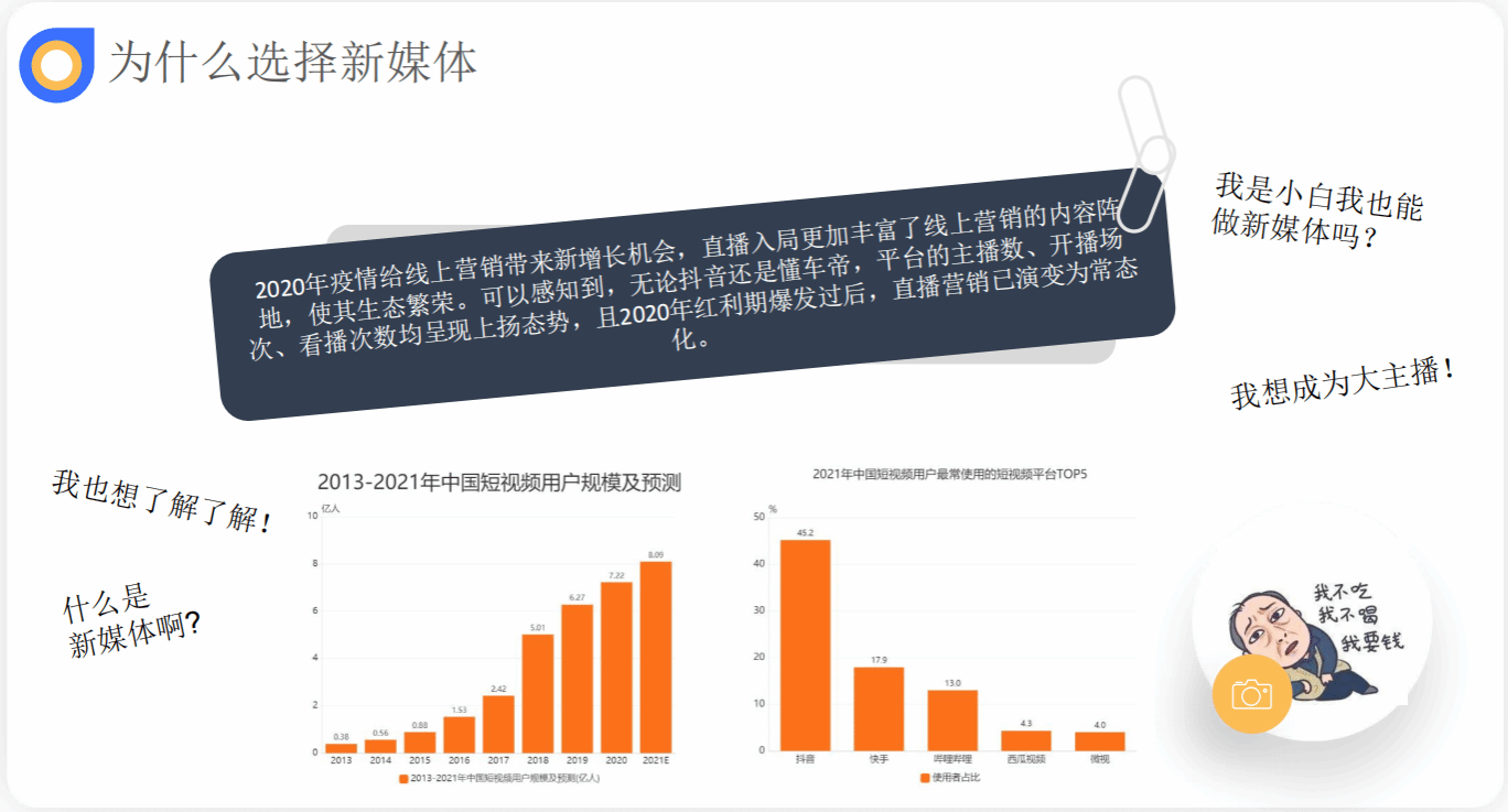 戴钰老师为同学们详细介绍了头角传媒的庞大规模、短视频赛道对于新媒体发展的重要意义以及头角新媒体项目介绍。作为新媒体生态链服务平台,头角集团紧紧围绕文化传媒、人才培养赋能、企业人力资源三大板块提供多项营销服务,为数字经济时代新媒体产业高情商经营管理人才培养提供更大的服务。