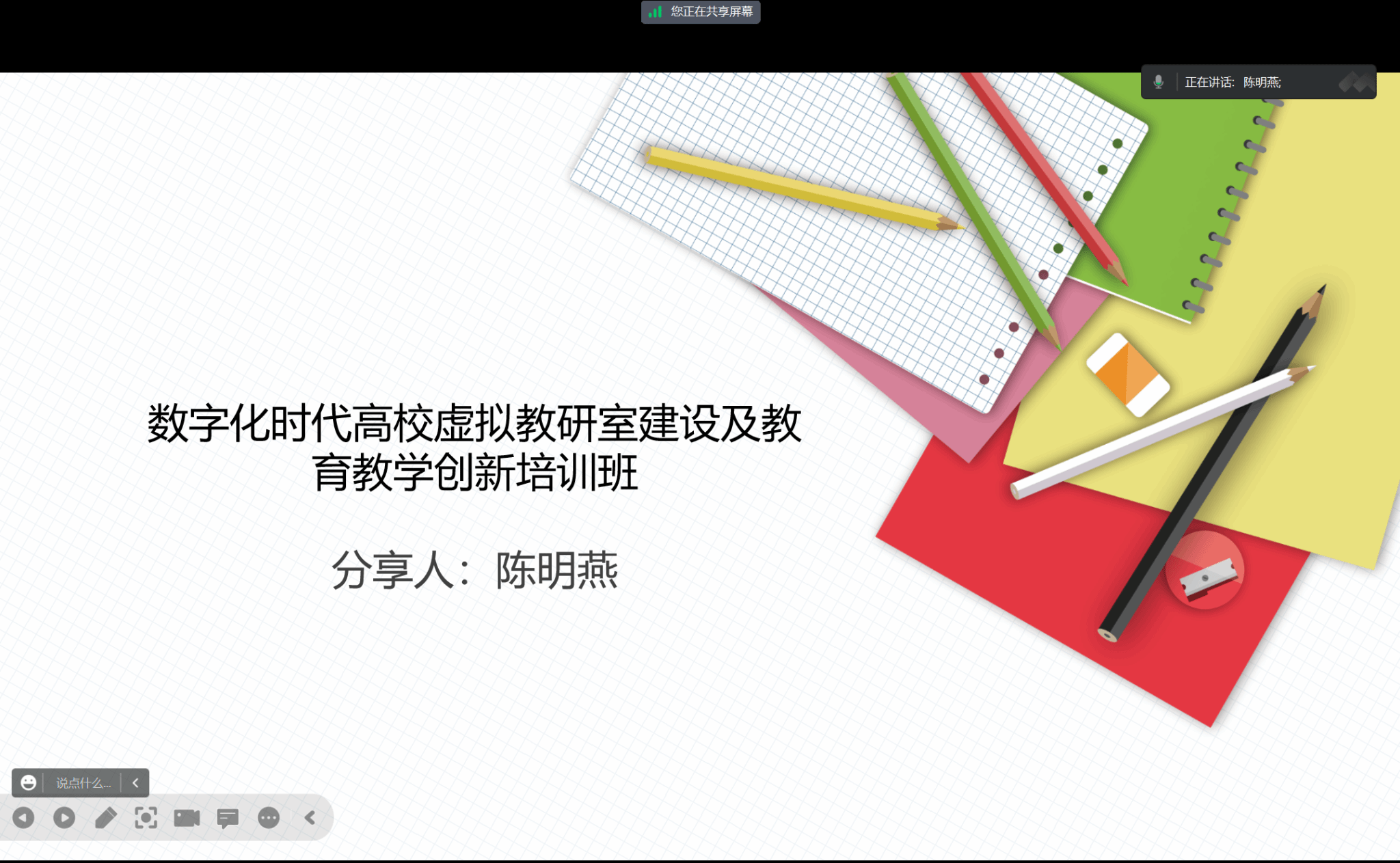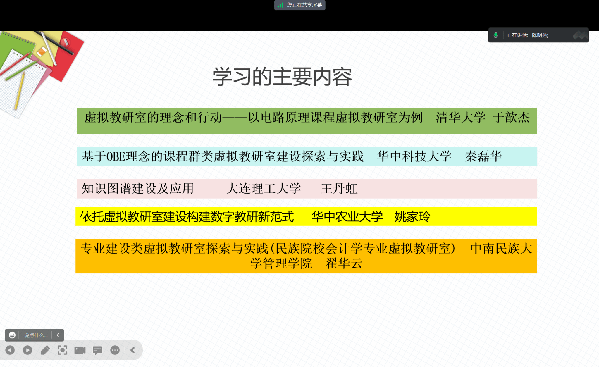 陈明燕老师参加的是数字化时代高校虚拟教研室建设及教育教学创新培训。培训中,许多的专家学者对于虚拟教研室的建设工作分享了宝贵的观点和建议。其中,涉及方面广泛,制度、团队和教学内容的建设均有涵盖。陈明燕老师从虚拟教研室的申请、团队够成、知识图谱的建设、虚拟教研室的运营管理等方面进行了分享。陈老师建议大家积极参加今后的高校教师发展主题会议与各类培训,并结合专业核心课程特色,凝练学习成果并学以致用,提升课程建设。