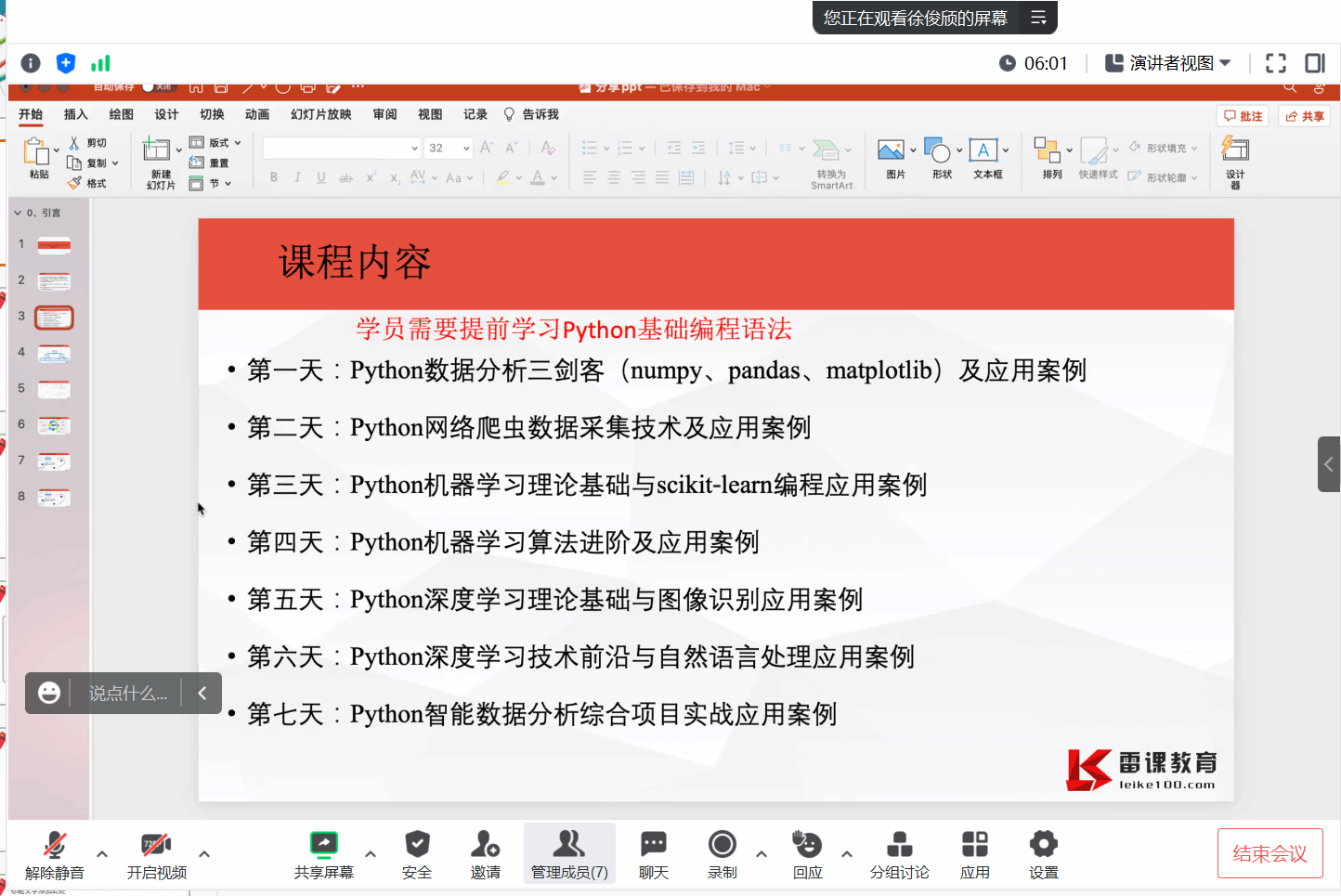 近期,徐俊颀老师参加了第二十三期Python智能数据分析前沿技术与应用案例培训,通过为期7天的充实学习对Python语言在数据分析上的作用以及机器学习的使用方面获得了更加深入的理解。培训中利用大量案例实践与理论相结合,内容丰富,干货满满。徐老师详细的为大家分享了培训中所学习了内容,并将相关学习资料共享给大家。在如今的时代,大数据和人工智能的发展吸引这各行各业的目光。在数字化经济的浪潮中,数据分析已经成为了当代大学生应具备的基础技能。学院也鼓励教师们多多参与进相关学习之中,并在课堂上增强学科间的联动的同时促进师生的多方向创新思维发展。