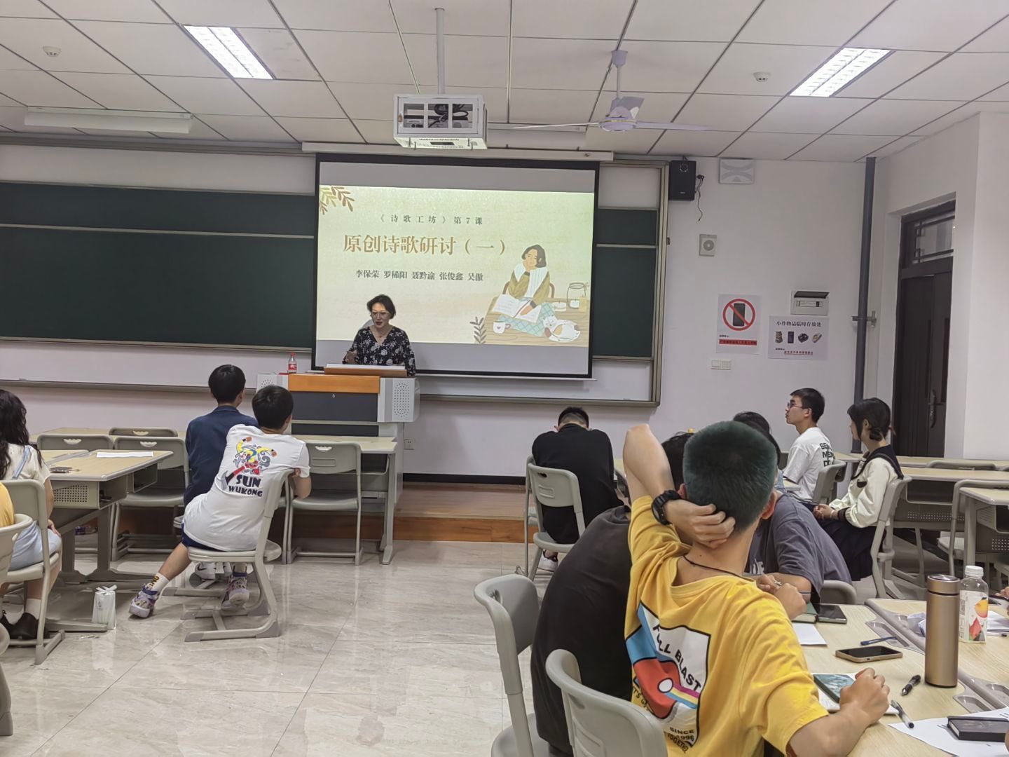 4月21日晚,仲春的尾巴捎来夏的气息,将坠未坠的日落染红了半边天,从它涂鸦板滴下的颜料溅落到仁者楼309外的路灯上,投射出一小方暖黄色的光。诗歌工坊的学子们踩着这片光影的律动,陆陆续续进入教室,昏暗的空间霎时变得明亮,诗歌工坊的第一次学生原创诗歌研讨就此拉开序幕。