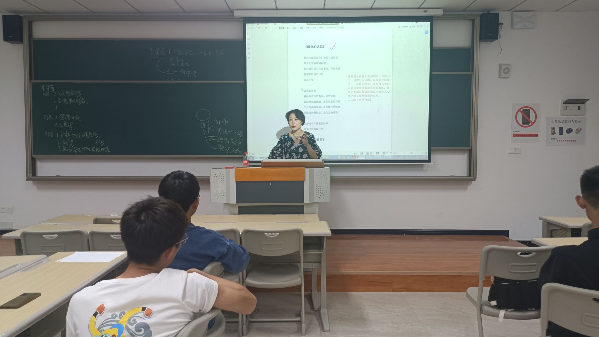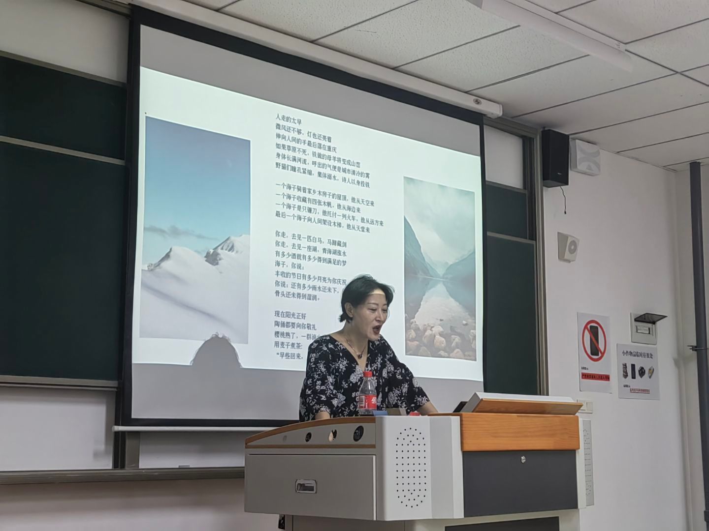 苏瓷瓷老师先给同学们分享了一首诗《海子》,并询问大家读完此诗的感受,同学们思忖着怎样去给出自己的评价,见状,苏老师并没有继续卖关子,而是向同学们介绍了本诗的作者赵威,也是我们的学长。苏老师说,这首诗是2018年校内诗歌大赛的获奖作品之一,后来经她的推荐,赵威学长的一组诗歌发表在国内知名文学期刊《山花》上。