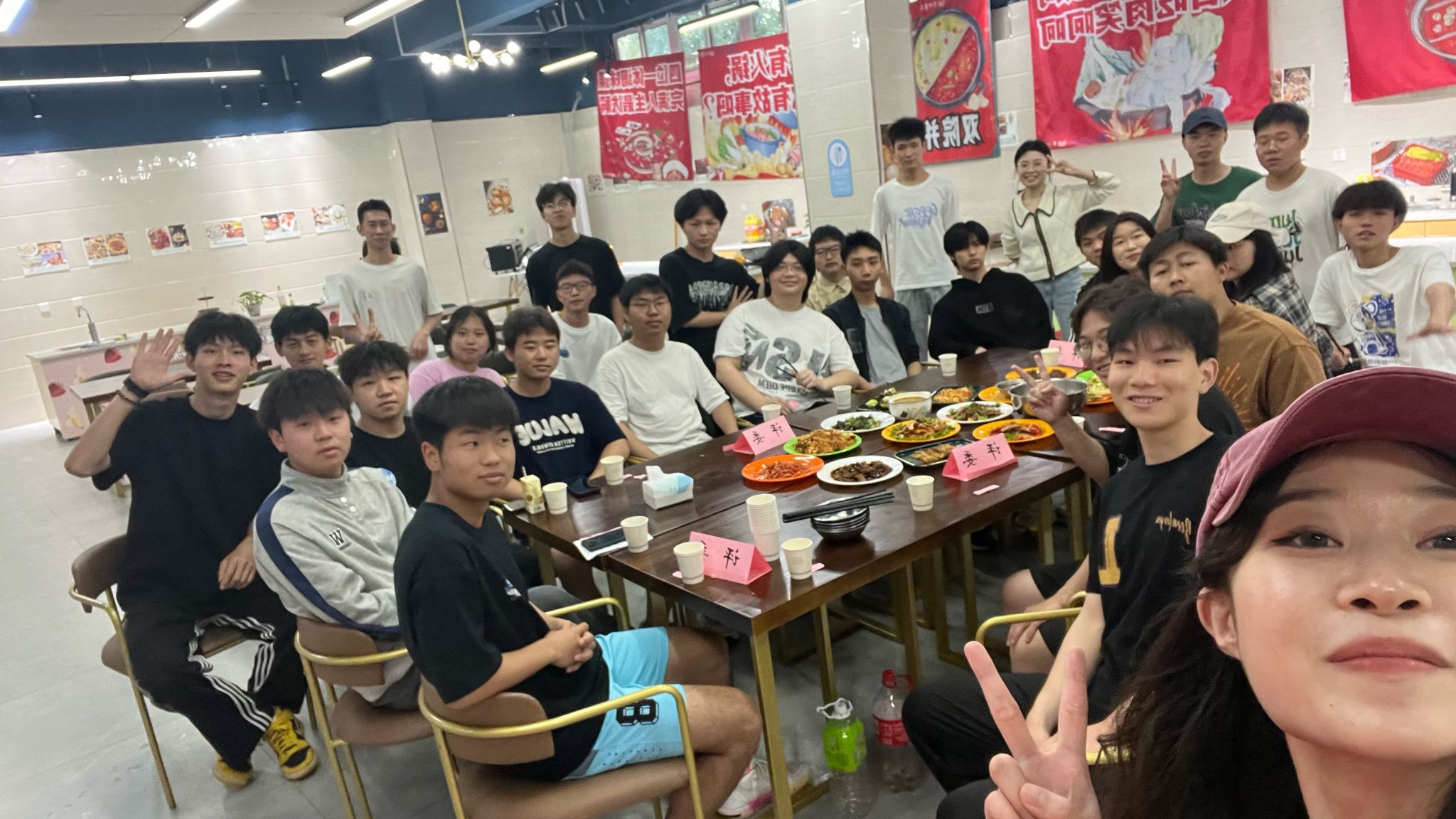 正式比赛开始后,共享厨房内响起锅碗瓢盆碰撞的金属声、清洗肉类蔬菜的水流声、食物遇见油的滋啦声,但更多充斥在整个房间的还是同学们的欢笑声。每个组都分工明确、有条不紊,一些同学展现着自己熟练的刀工,一些同学则自信地展现着锅中的翻炒技术,每组同学都为了能够赢得比赛而专注在自己的料理台上。