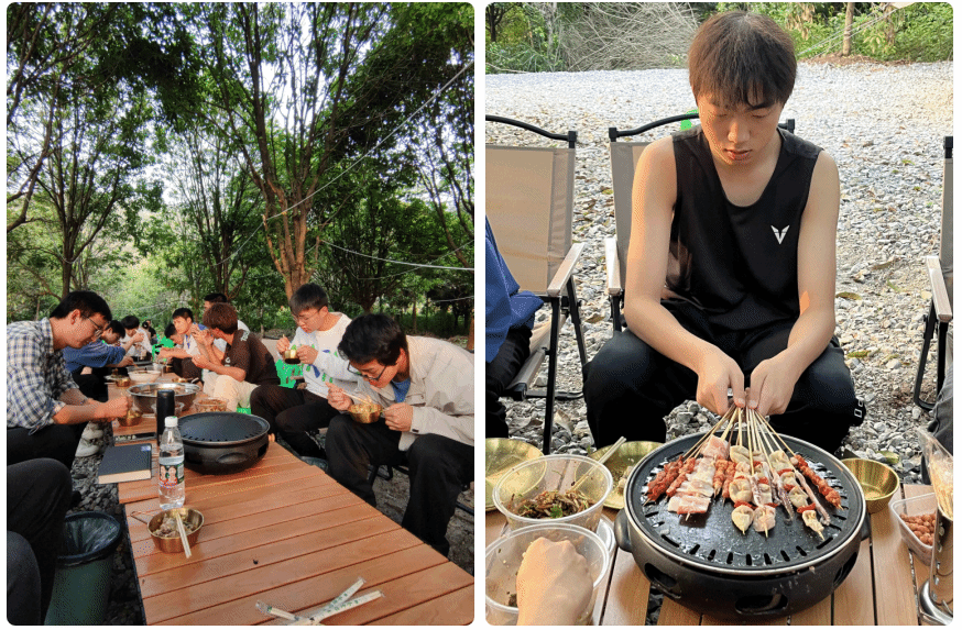 自己动手,丰衣足食。在看过春的灿烂,感受完阳光的温暖后,同学们开始忙碌今晚的烧烤晚餐。一些同学拿着盆洗菜,一些同学在案板上展示自己的刀工,一些同学在准备烧烤所需的调料,一些同学负责锅碗的摆放,钓鱼的同学炫耀着自己在天阳下晒了一下午的收获,并说着要同学们欺尝尝他们的煮鱼手艺。晚餐准备工作结束后,大家吃着自己钓的鱼,烤上自己准备的食材,聊着自己的青春故事。羿科导师吴如涛、陶辉也借此交流了彼此的异科异师活动开展心得,进一步了解了同学们的校园学习生活情况。晚餐结束后,师生在露营点合影留念。