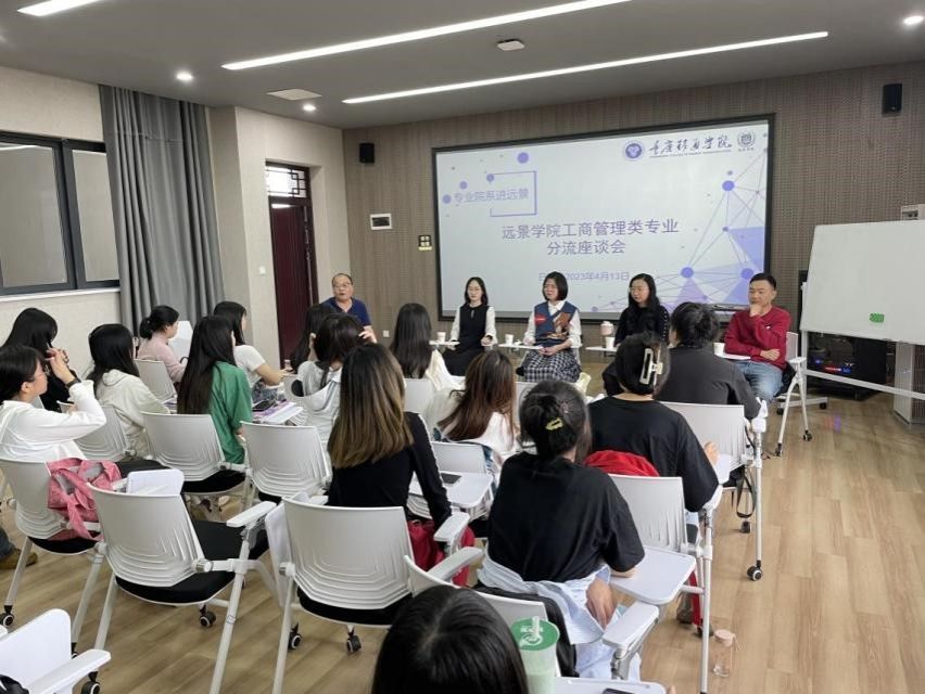 4月13日,淬炼·国际商学院走进远景活动中,教研室主任杜嘉老师对专业设置、分流原则、分流工作流程等作出了详细介绍,说明理性谨慎认识专业分流的重要性,向学生们提出“心态放稳”、“思路清晰”、“信念坚定”三点希望。她积极呼吁同学们去了解自己喜欢的行业背景,做一名全能型人才,提高自我价值,增强对专业知识的兴趣并最终将所学的知识运用到社会生活的各个方面当中去。接着,师生们围绕学院四个专业的就业趋势、课程设置、考研情况等方面进行了深入细致地讨论,老师们从更加专业、更加全面的角度出发以帮助同学们了解各个专业的具体情况。在交流探讨环节中,陈冰川老师指出,在学业方面,三个专业各有特色,优势明显;在就业方面,学生们应注重掌握并适应当下人才市场的新模式、新趋势、新需求。陈老师用自己的经历向学生们呼吁——去试错,来找准方向;去尝试,来加快速度;去探索,来无悔时光。