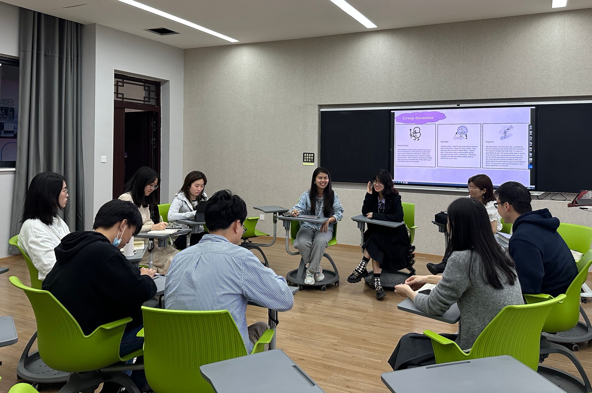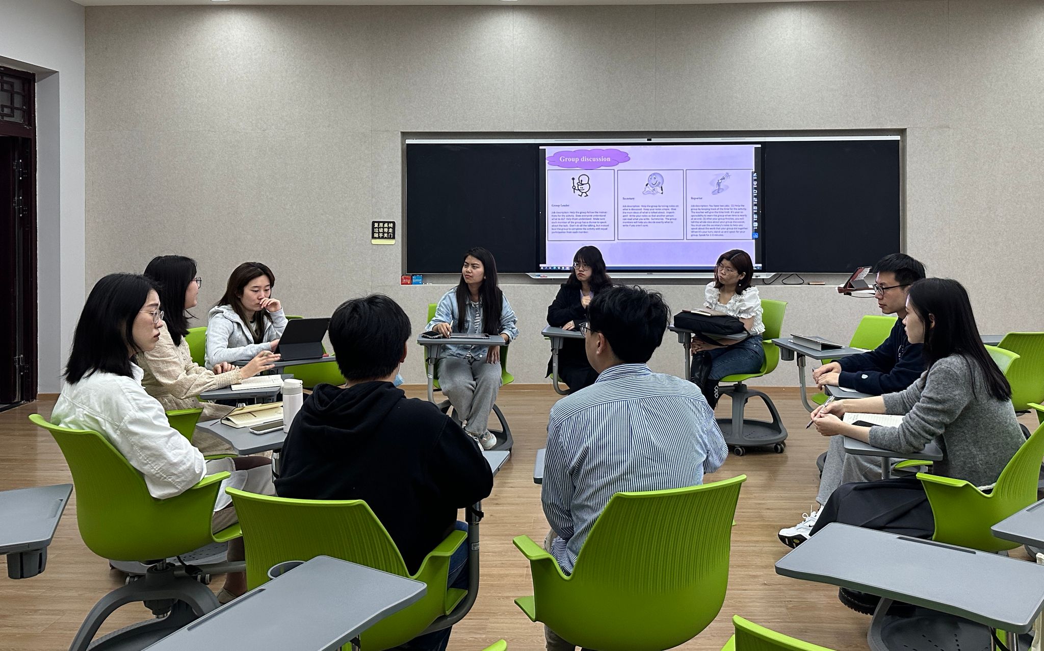 最后,教师们就“如何提高全体学生课堂小组讨论参与度“这一问题进行研讨。各位教师积极分享目前各自课堂中小组讨论与教学的相应情况,并就出现的问题提出解决方案,如适当调节课堂讨论问题的难易程度;设立清晰目标,即讨论结果呈现目的是追求内容质量还是语言表达质量;小组成员设立分工角色,每周分工不能重复等等。刘达老师提出,对于较难的课堂讨论主题,教师可课前分发相应材料,推进学生自主学习,克服畏难情绪,提高讨论参与度与积极性。