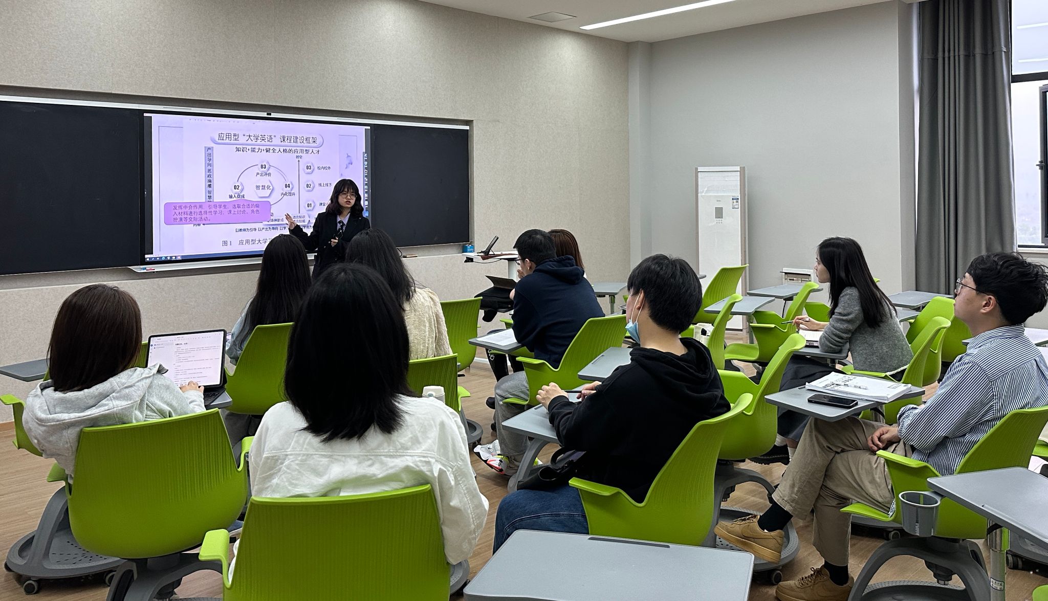 为促进学科之间交流,加大课程教研教改活动力度,为教师们营造一个开放包容、互动进取的教学教研环境,群策群力,共促发展,綦江校区远景学院基础课程教研室推出课程设计研讨系列活动,于每周四下午进行。2023年4月13日下午,第一次研讨会于智者楼406智慧教室拉开序幕,由教研室主任唐智盟主持会议,教研室全体教师参加。在研讨会上,唐智盟主任就目前困扰新教师的教师绩效考核标准、课程相关问题以及学院宣传稿投稿标准进行解读。黎美茜老师就“以产出导向法为基础来设计课程”进行了分享,并提出“如何促进学生积极参与小组讨论” 这一课堂教学中的实际问题,参会的各位专任教师针对此问题展开了讨论。