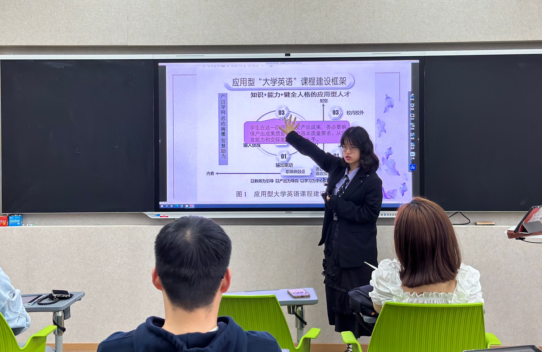 随后,黎美茜老师以英语课堂为例,分享了以“产出导向法”为基础来设计课程的理念与实践。在英语课程设计时,采用“产出导向法” 的“输出驱动—输入促成—产出评价—内化提升” 教学模式,突出“以教师为引导,以产出为导向,以学习为中心,以学用为核心”的理念。黎老师建议,在通识课程的行课过程中,要让学生带着问题来到课堂,以解决问题为导向引领学生沉浸在课堂学习之中,并带着新的问题离开课堂,课后再度深层次思考,从而达到内化提升。在备课时,教师应将精力汇聚在收集教学资源、整合教学内容上,结合教学目标,巧妙设置每堂课程的课前任务,结合时事精心设计教学内容,激发学生思考,培养学生课后学习的主动性、持续性。在输入促成阶段,教师应充分发挥中介作用,引导学生选取合适的输入材料进行学习;以语言知识和语言技能为核心,恰当融入思政元素进而反映情感态度与价值观;结合实际,适当融入职场英语。如此,整个教学流程将形成良性循环的闭环。除此之外,黎老师认为各位老师需要意识到,学生对于一门课程的学习并不终止于课下响铃,而是起始于他们在课堂上与教师交流、思想碰撞之间。我们教师需要做的就是推进这个进程。