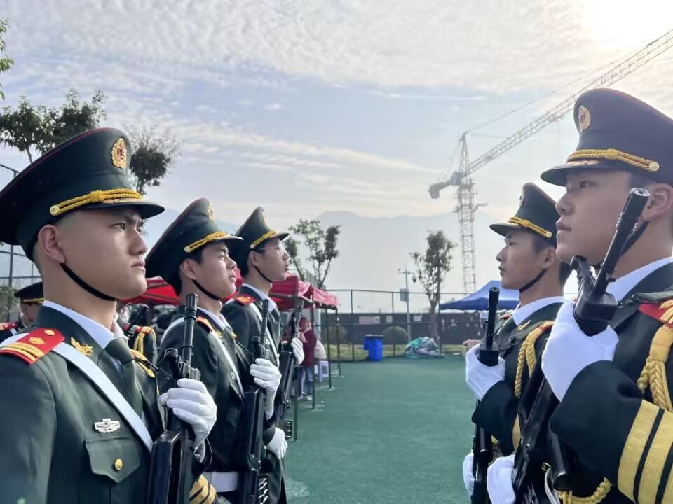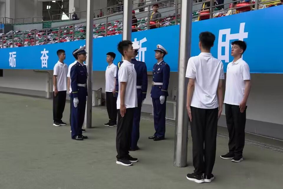阳光正暖,微风不燥,4月14日上午九点,重庆市綦江区运动会正式开幕。伴随着激昂的音乐,在区体育馆10000余人的瞩目下,五星红旗领着参赛方阵入场,紧随的是我校12名国旗护卫队队员将区运会会旗、区第二届运动会会旗护送入场。会旗以白色为底色,取綦江字母“QJ”为主要元素,同时有机融入青山绿水、奔腾的綦江河,运动圣火、跑道、彩带等视觉元素,形象直观地表达出綦江的美好形象,体现出綦江城市的活力与动感。与大学生的蓬勃生机交相辉映,他们昂首挺胸,动作整齐划一,在行进间努力回忆着张桃教练和徐新智学长前些天对他们的嘱托,认真思考每一个细节。伴随着出旗的口令,摆臂、行走、正步、举旗……第一项任务结束;伴随着高昂的会歌,挂旗、甩旗、升旗……第二项任务结束……每一个动作都一丝不苟、规范协调。