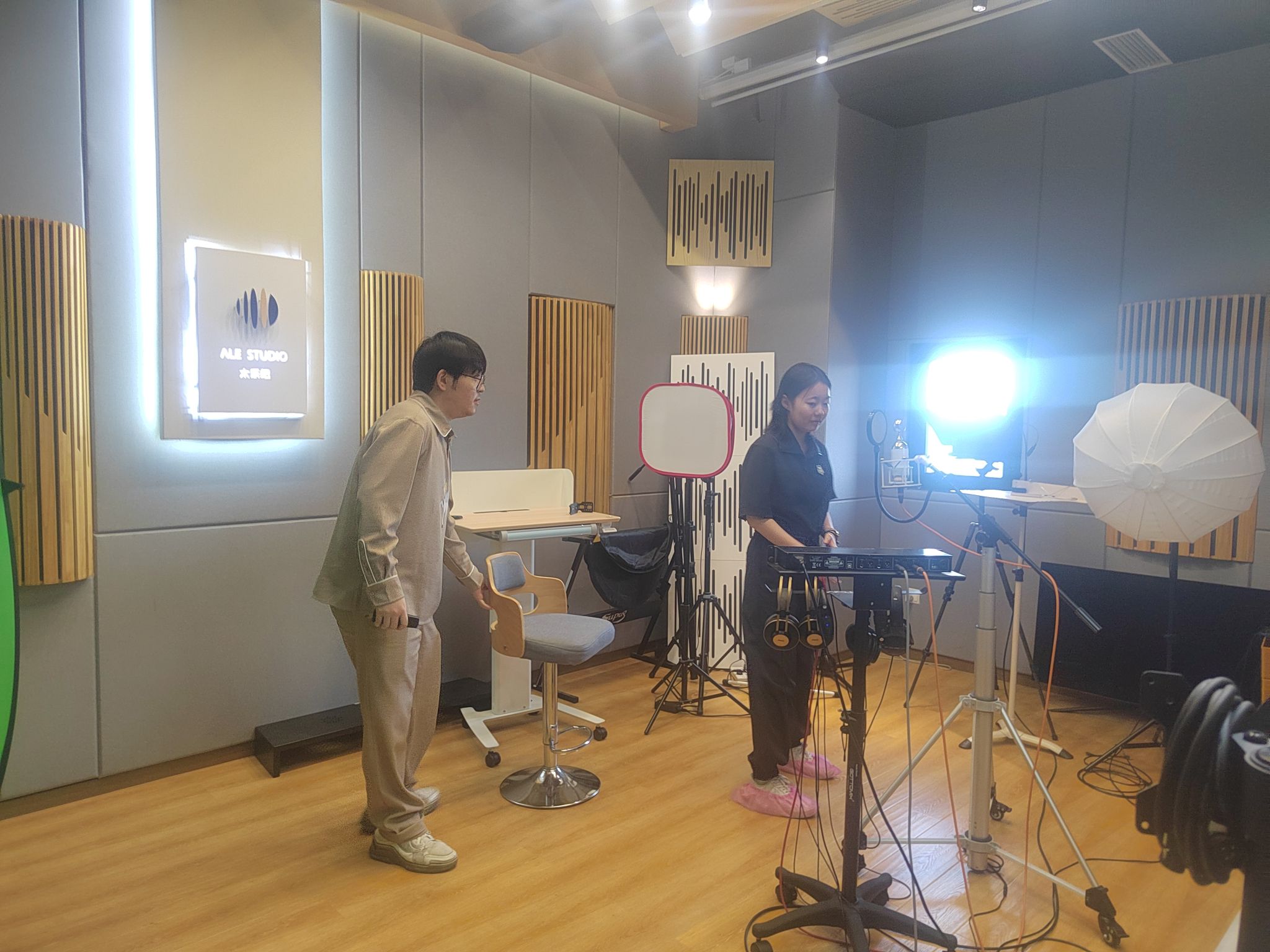 参观过程中,李老师以幽默风趣的语言进行解答了同学们提出的各种问题。随即,2021级国际班学生孙小骞现场演唱歌曲,协助李老师展示录音棚的工作流程。最后,同学们在李老师的指导下亲身体验在录音棚演唱。李老师对他们的声音进行了专业的点评。