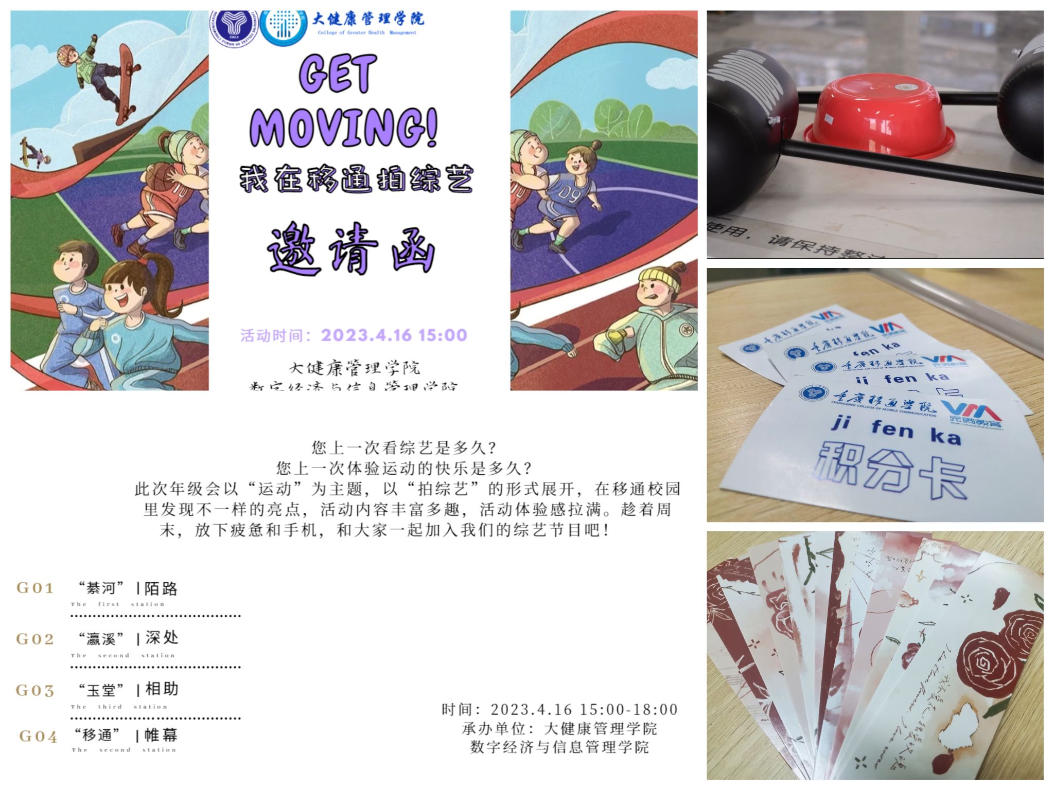 FUN肆开跑,向健康打CALL,SHOW向上活力,以运动逐光影,承初心历前行!为营造积极、团结、凝聚的气氛,进一步探索以运动为载体,全面释放压力、积极应对专业学习的新途径。增强学生身体素质,增进同学之间的交流,培养同学们团队协作精神。丰富校园文化生活,提高学生的运动健身意识和身心健康水平。数字经济与信息管理学院管理科学与工程类3-5班&大健康管理学院体育经济与管理1-3班于4月16日15:00—18:00在綦河书院中庭、瀛溪书院中庭、玉棠书院中庭、操场举办了“Get Moving!我在移通拍综艺!——“綦”遇之旅主题年级会。此次年级会采用综艺的特色形式展开,借助视频和照片来记录移通er运动和奔跑中的欢声笑语,来到现场的参赛人员和工作人员都佩戴校徽,衣着整齐,大家期待着在此次年级会中能共同感悟团队协作的力量与竞技体育精神。