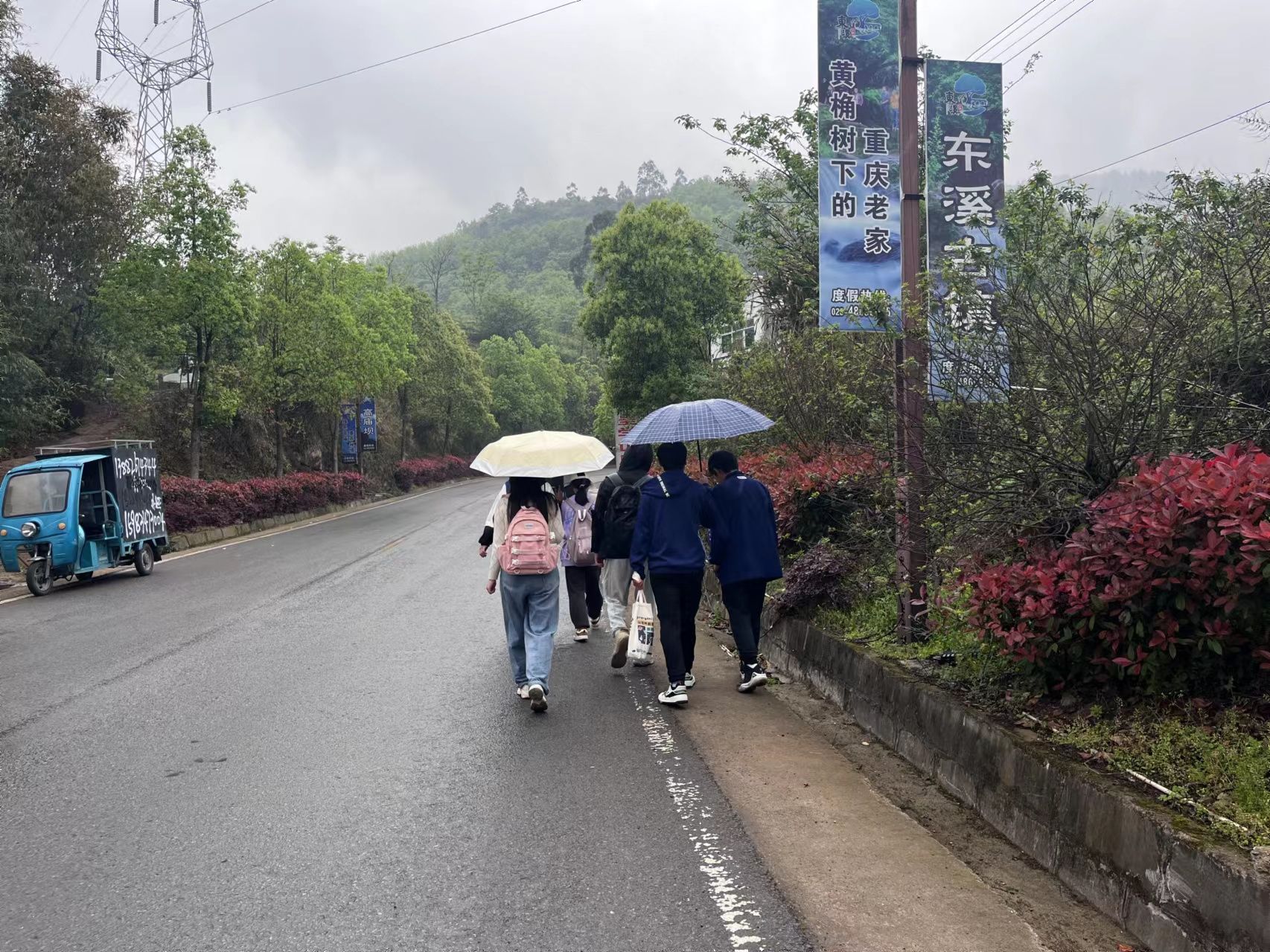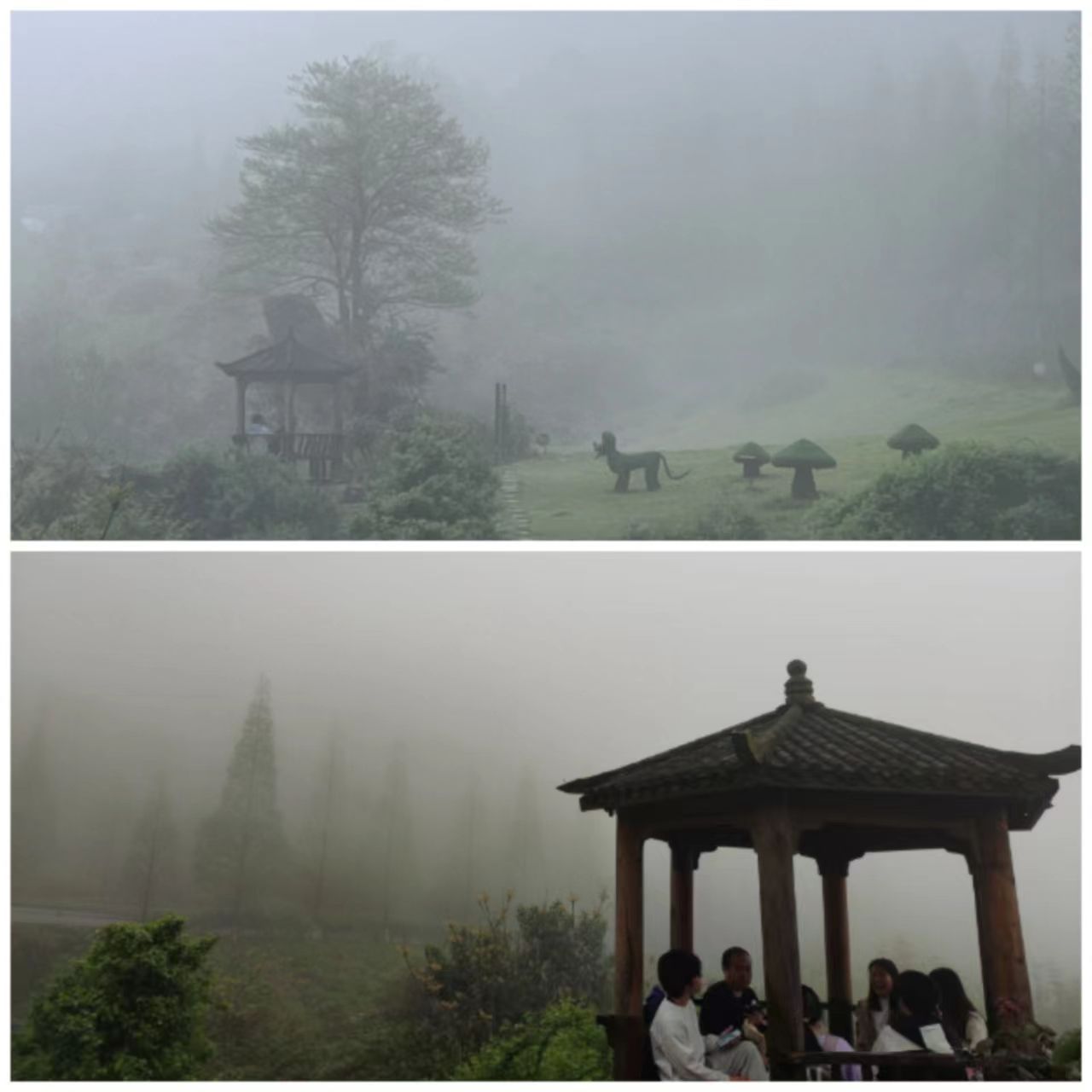 旅途伊始便伴随着濛濛细雨,雨中的古剑山显得愈发朦胧与青翠。学生们从山脚下沿着盘山公路向上攀登。行至中午,恰好遇到了一处山庄,于是大家便在室外的小亭中围坐在一起,一边吃饭一边畅聊。