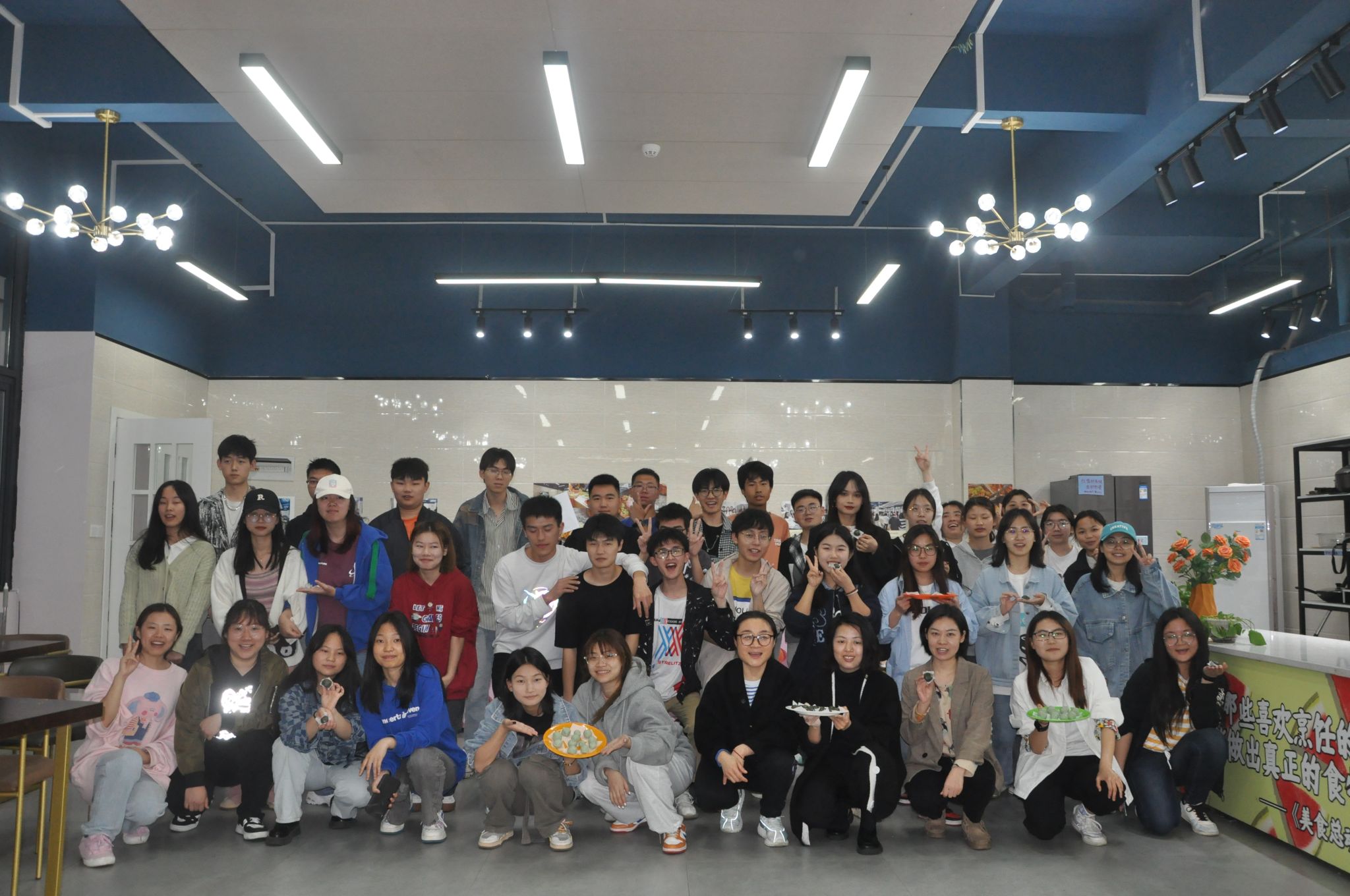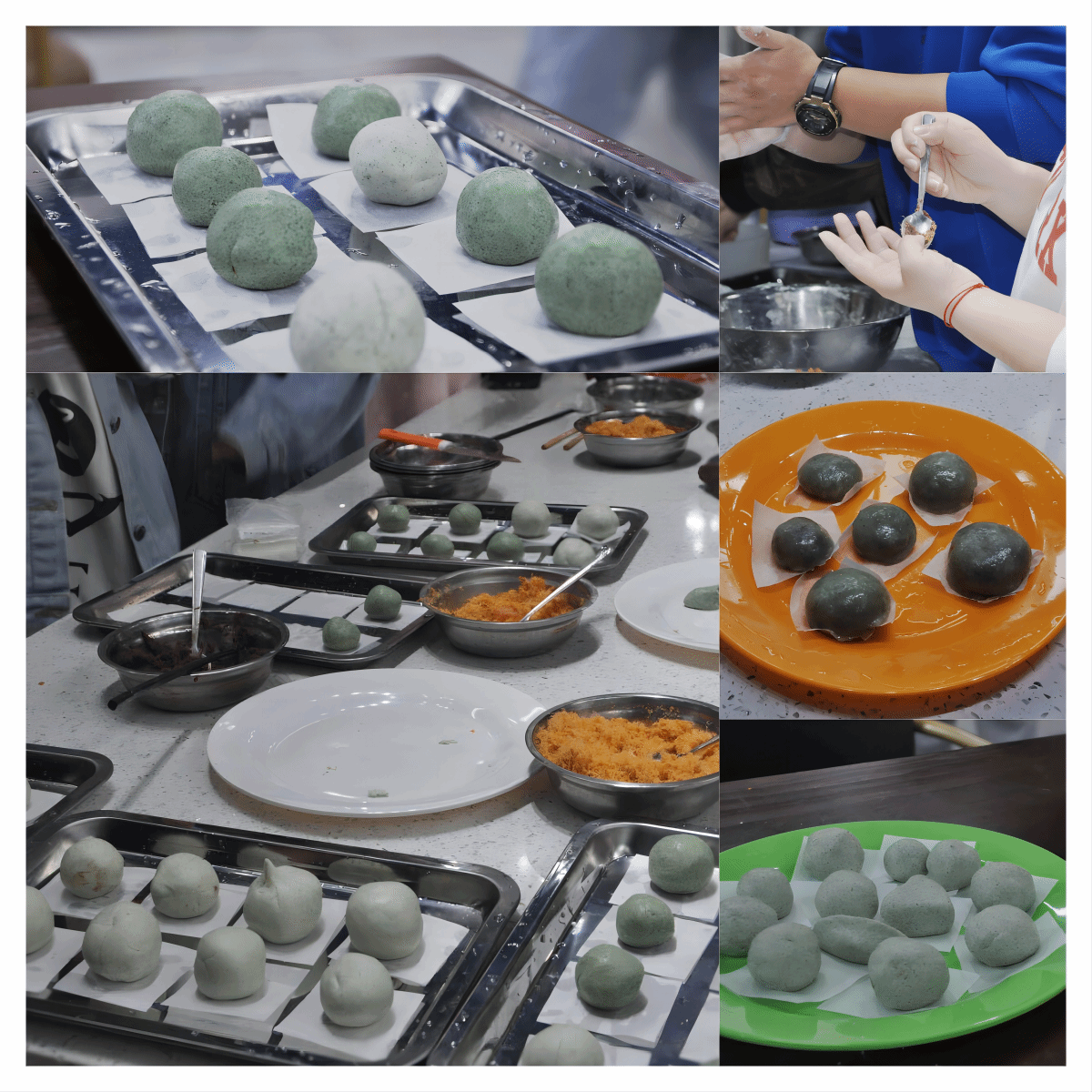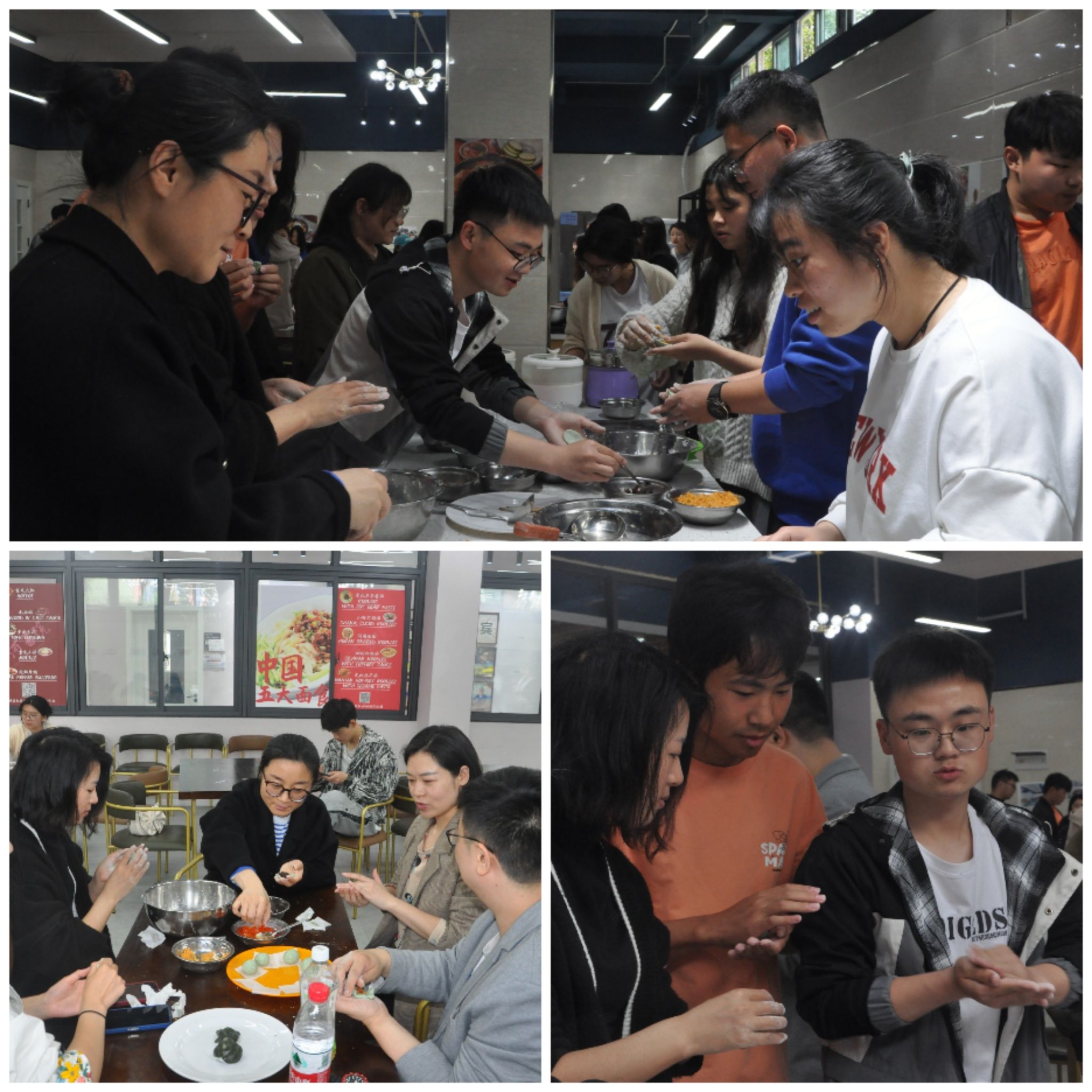 在綦河书院2号楼的共享厨房,博雅协会邀请到通识教学部的张艳、冯婷、涂杨杨、罗振嘉四位老师一起体验青团制作。几位老师边做边指导同学们:“我们和面要注意加油,蛋白质与油脂结合能形成脂蛋白,使青团的粘弹性更好。”同学们在老师的指导下动手实践。