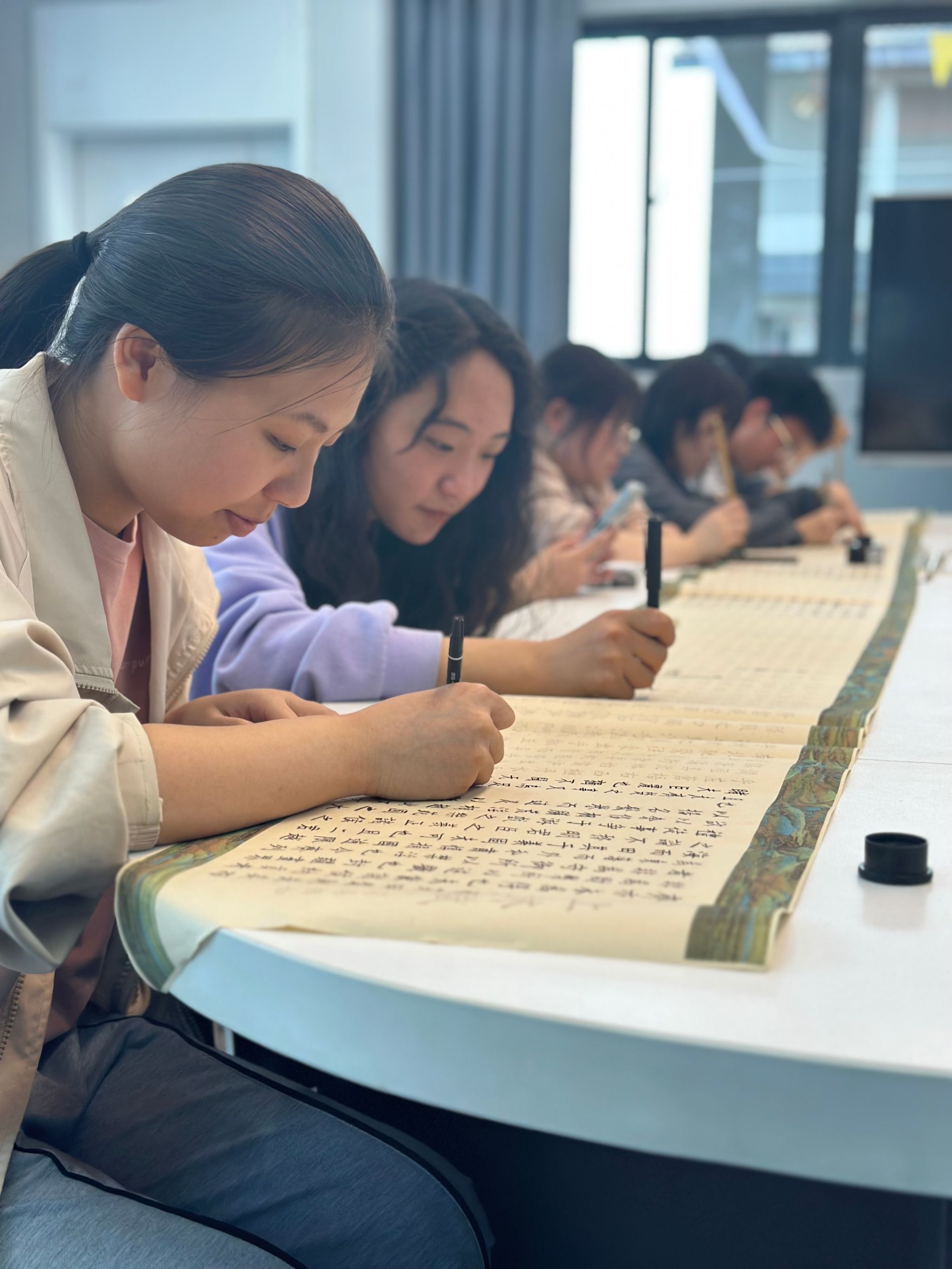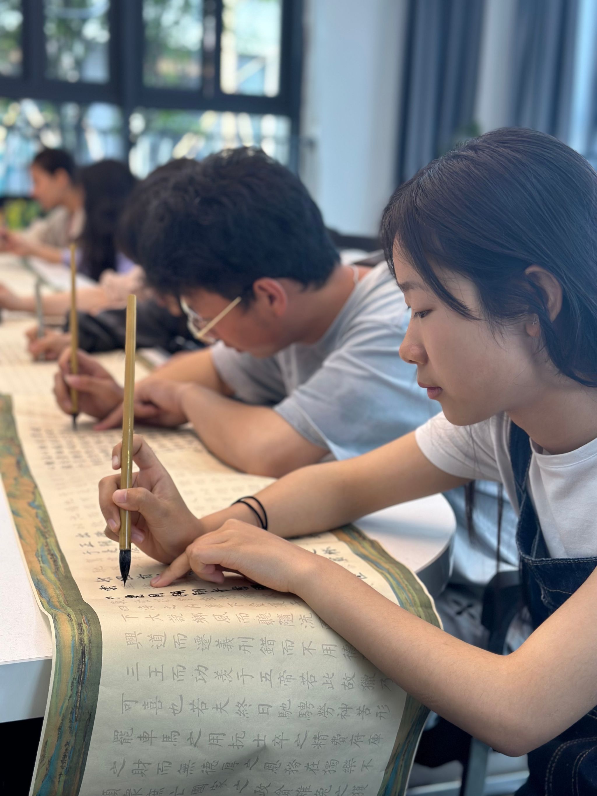 《上林赋》字帖卷轴总共有5米长,分发完笔后,大家便开始迫不及待拿起笔在卷轴上书写,大家细心地一撇一捺进行着临摹。伴随着悠扬的背景音乐,同学们沉浸在这一缕墨香之中,甚至不知时间流逝。