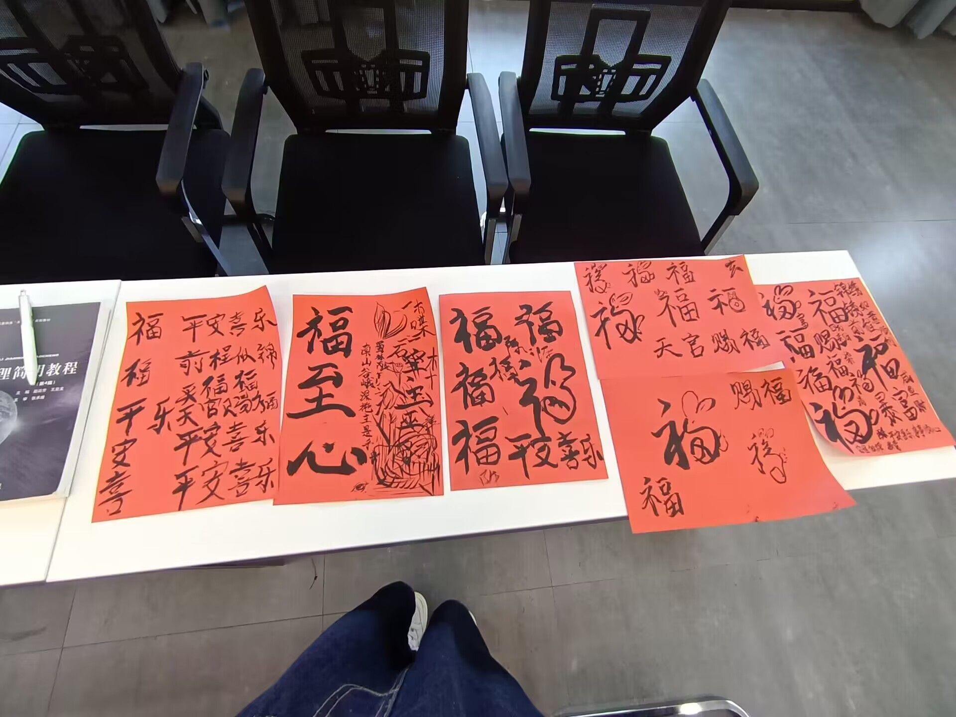 写“福”字环节,纸张选用了红色宣纸,增添了一份艺术妙味。看着红彤彤的宣纸,大家的积极性提高了,思维也打开了,写出了形态不同的“福”字。例如在“福”字的基础上添加一些兔元素,虽然没有在过年的时刻,但是依然感觉年味满满,喜气洋洋。