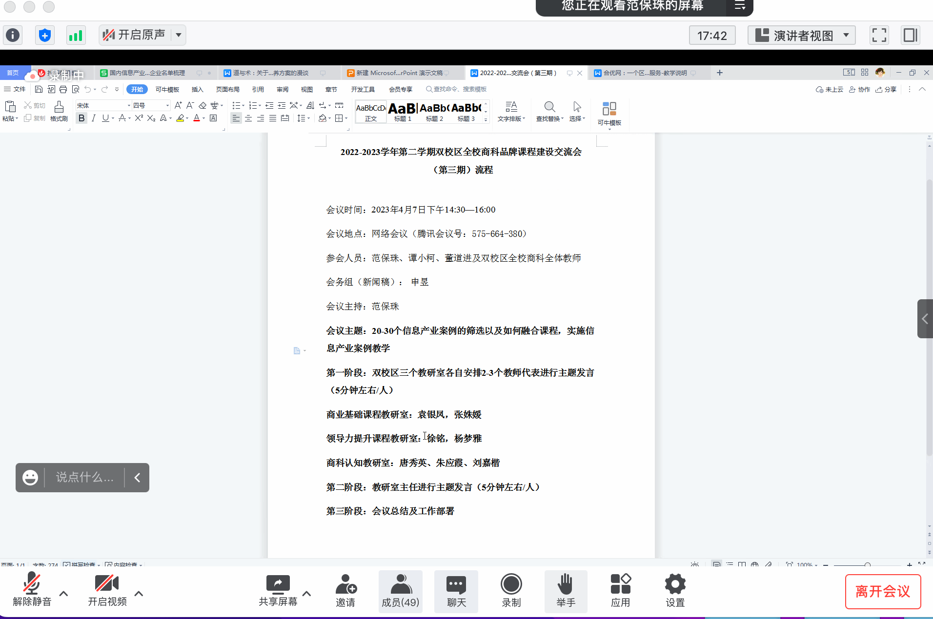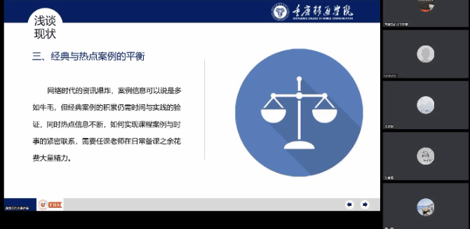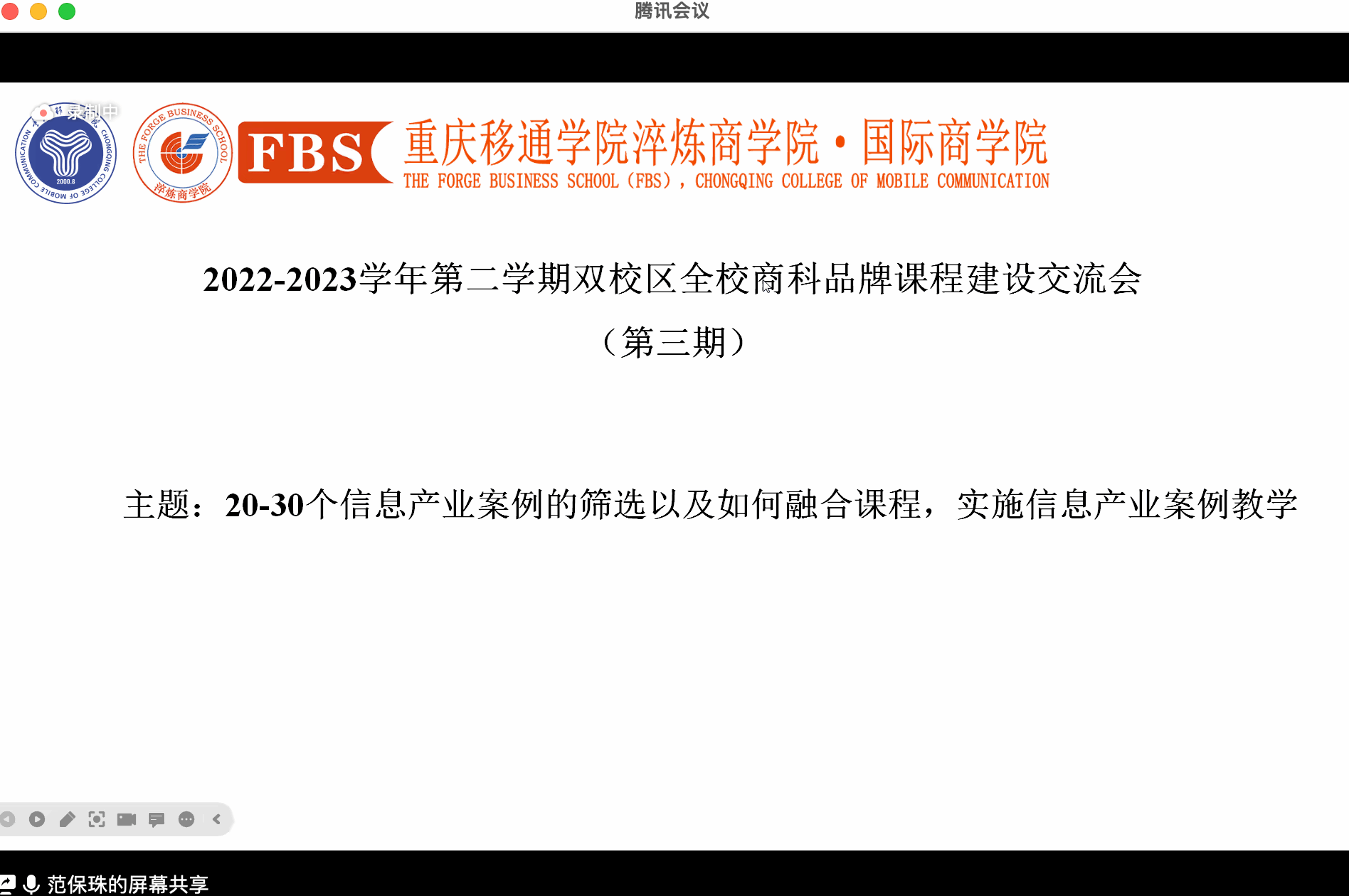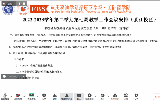 为贯彻我校办学理念,进一步推进全校商科品牌课程建设,4月7日14:30合川、綦江两校区联合开展了全校商科品牌课程建设交流会,本次会议在“腾讯会议”举行,会议由范保珠副院长主持,全体教职工参与了分享交流。本次会议一共分为三个阶段,分别是各教研室教师代表进行主题发言;教研室主任联合发言;会议总结及工作部署。
