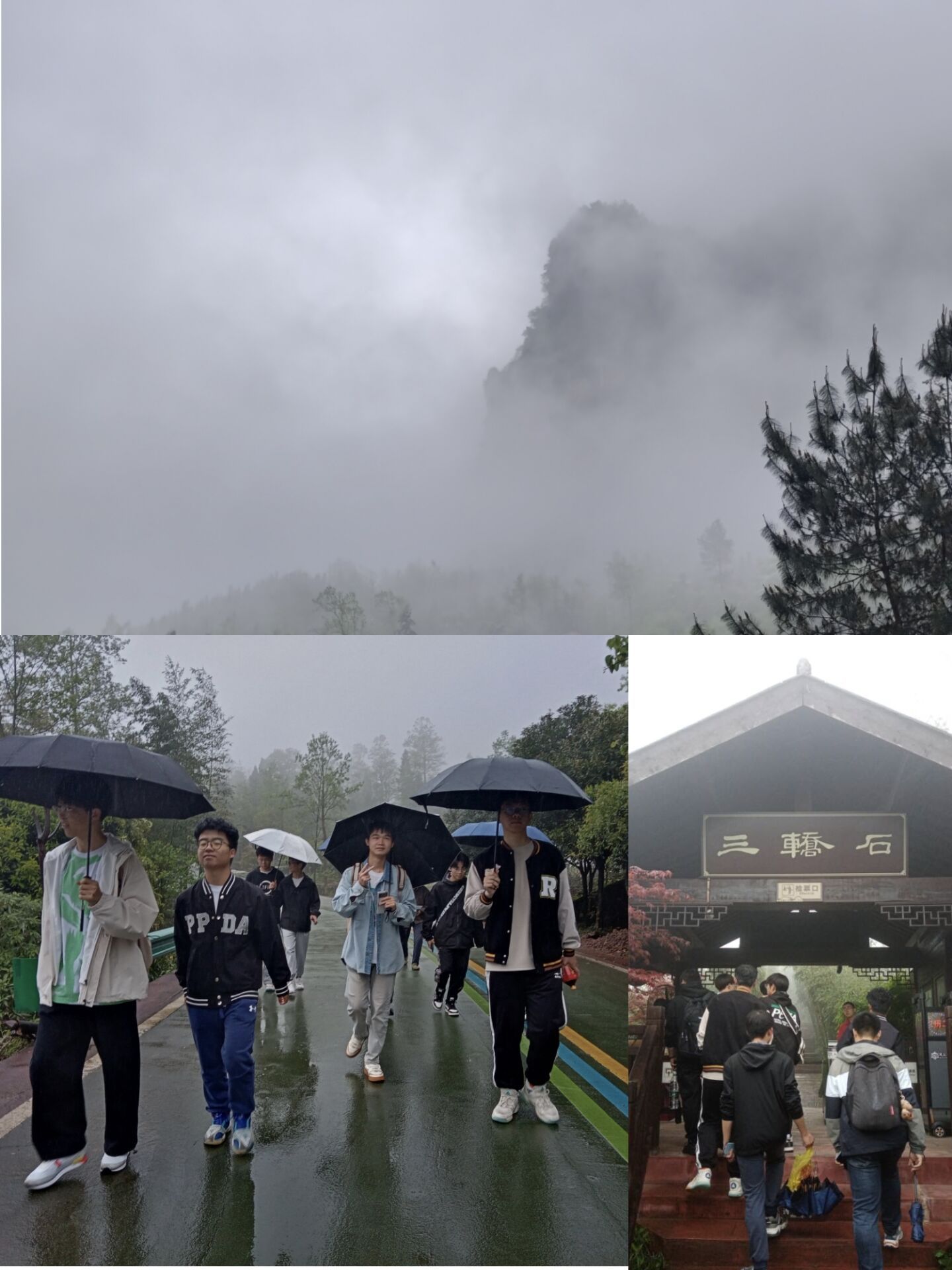 当天上午,我们一行人打车到达老瀛山的亲子广场,虽然阴雨绵绵,雾雨朦朦,但同学们的登山热情丝毫不减。从亲子广场徒步走到三桥石广场的路上,看着不远处奇山兀立,群山连亘,苍翠峭拔,云遮雾绕。