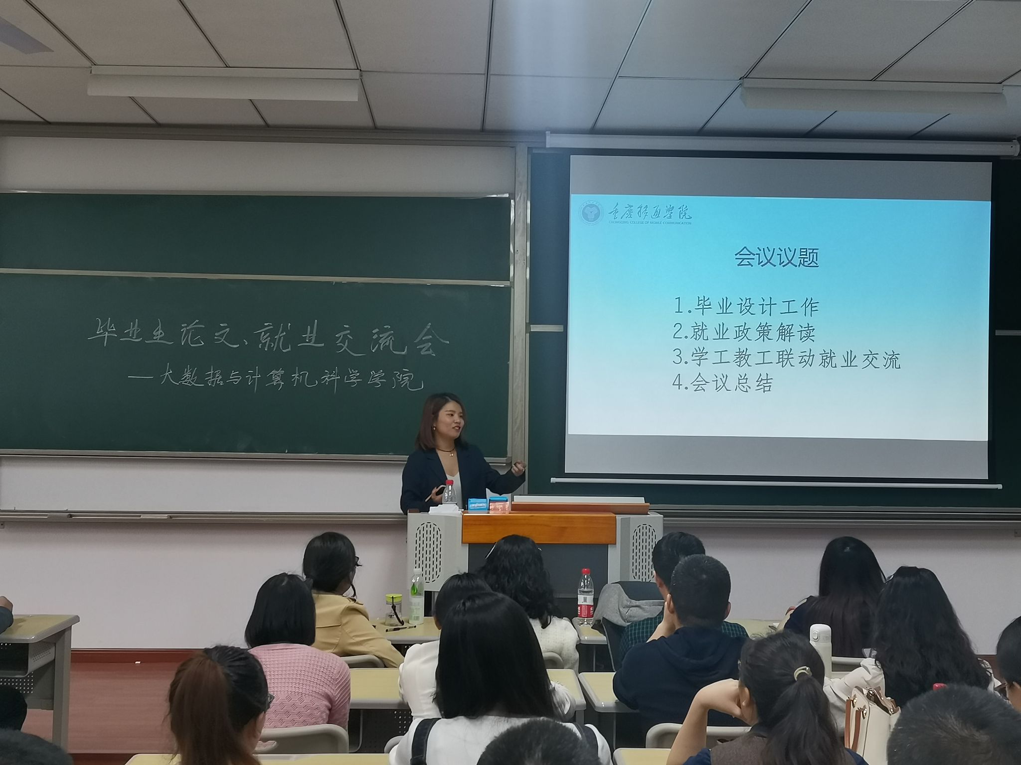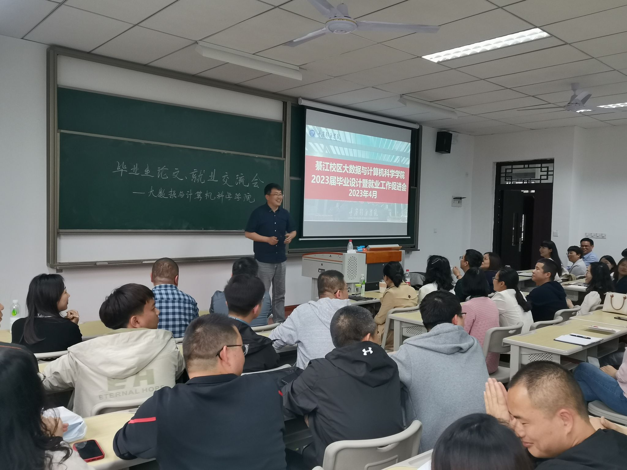 为深入贯彻党的二十大精神,认真落实党和政府“稳就业”、“保就业”的决策部署,进一步开展2023届毕业生的就业推进工作,4月12日下午,綦江校区勤者楼309室,大数据与计算机科学学院携手信息安全学院,共同召开了2023届毕业生就业工作促进会。大数据与计算机科学学院院长闫会峰、副院长向碧群、副院长林泽金及全体专任教师;信息安全学院院长王宁及全体专任教师;大数据与计算机科学学院就创办主任周义巧及毕业班辅导员代表共70多名教师参加了本次就业促进会议。本次会议包含毕业设计与就业指导两个议题。