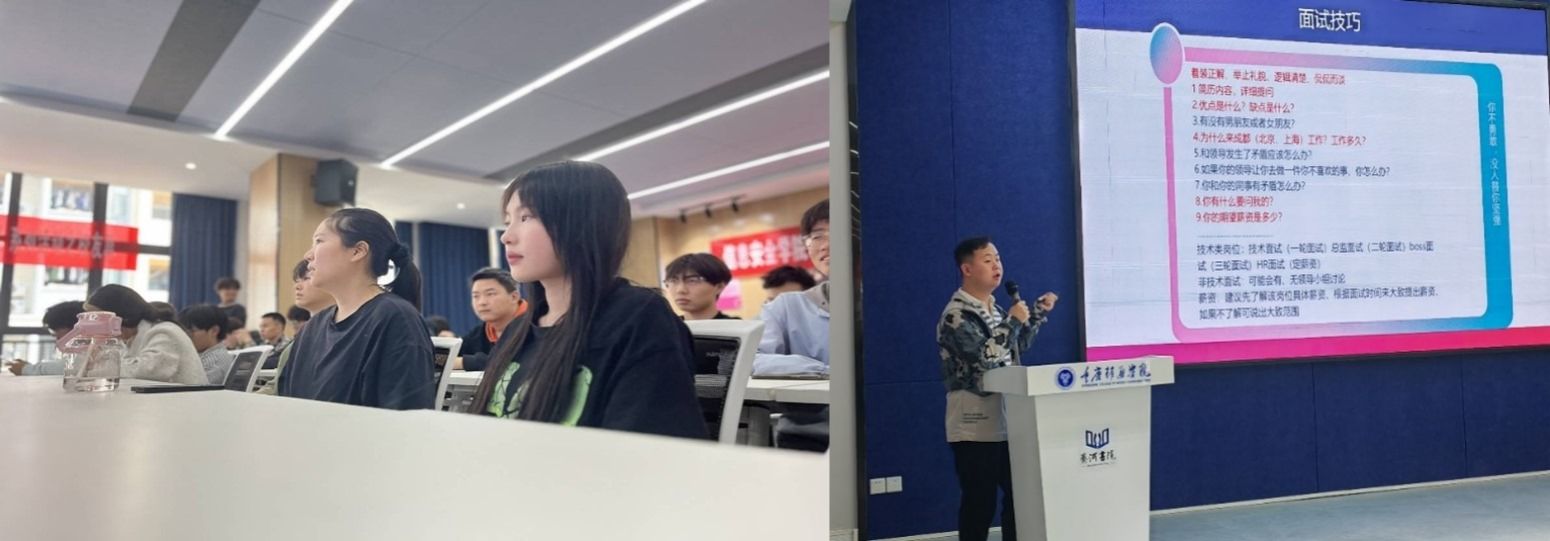接着乐露学长向同学们讲述了具体的求职流程。第一是简历的制作,学长强调到无论是简历还是面试,呈现的内容都要真实、能禁得起面试官的提问,实习经历,工作内容等要着重体现个人能力、重点展示自己处理问题的方式与能力;第二是简历的投递渠道,学长向同学们推荐了线上、线下两个维度的简历投递渠道。第三是求职过程中必备的流程——“公司验证”,学长谈到:“这关系到同学们后续就职环境的真实性和合法性,甚至是财产安全和人身安全,大家要多方面考究,再签订就业协议”。最后是面试技巧的讲解,学长主要从面试流程、面试着装、面试内容以及如何绕开陷阱问题,从容化解面试官的压力等方面做了精彩的分享,同学们纷纷表示受益匪浅。