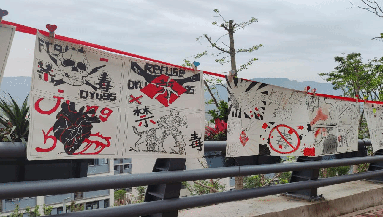 在线下活动的现场,参与者们带着精心绘制的作品前来,每一副作品都主题鲜明、独具一格,突显出作者自己对禁毒的理解与思考。志愿者将优秀作品一一展出,吸引了路过的同学们驻足停留、仔细观看。对于现场整齐摆放着仿真毒品,志愿者们通过毒品介绍牌、有关制毒器具等等向大家进行宣讲,热情地向同学们介绍毒品相关知识,做到全面深入的禁毒宣传教育。