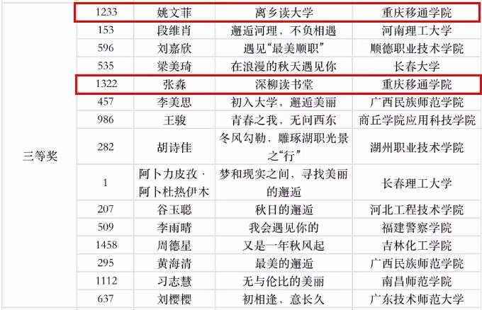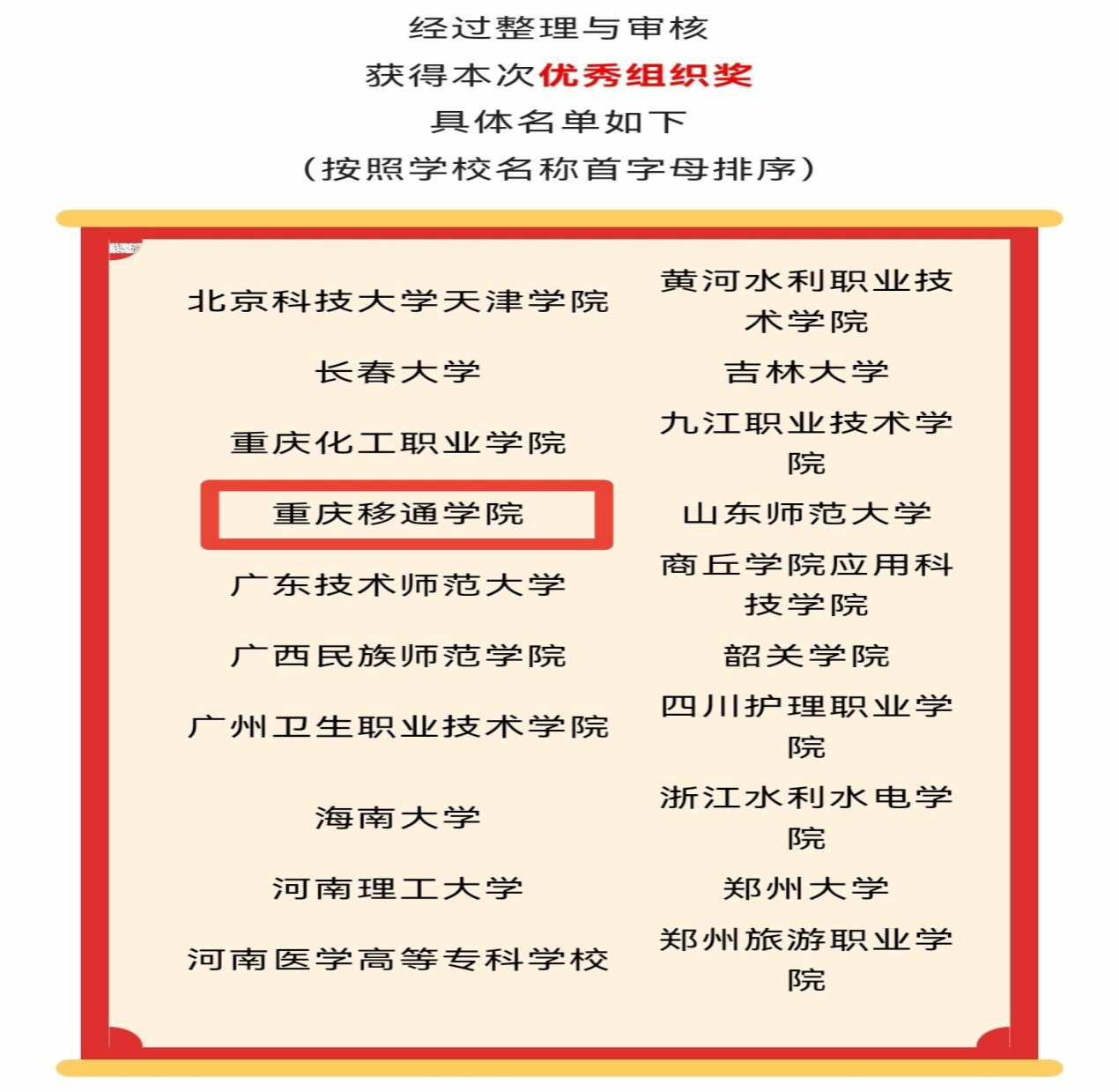 此次征文活动得到了各位老师和同学们的热情回应,也见证了很多同学对学校真挚的感情。最终我校从全国数百所高校中脱颖而出,获得优秀组织奖,是重庆民办高校中唯一获奖的学校。姚文菲,张淼同学荣获全国三等奖。多名同学获得积极参与奖。