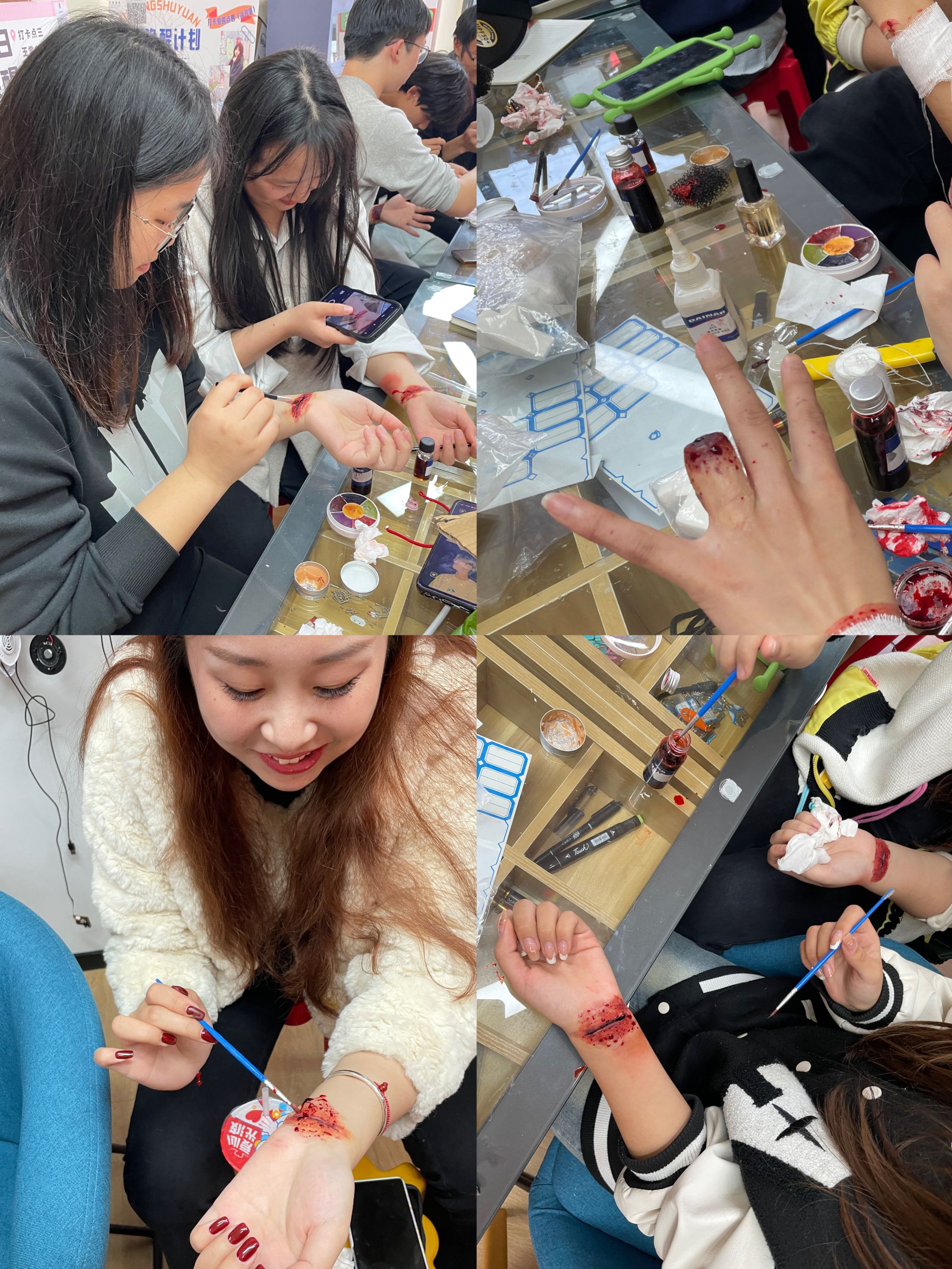 工作坊第二期给同学们准备了特别活动:影视特效化妆。活动开始前,谭老师给同学们展示了要使用到的化妆工具——血浆、油彩盘、肤腊、酒精胶......这些工具一摆在桌上,瞬间就引起了在场同学们的好奇,在谭老师介绍了使用方法后,大家都跃跃欲试!谭老师带着同学从最简单的淤青妆、擦伤妆、烧伤妆上手学习,再到割伤、断指伤妆的制作,同学们兴致勃勃,纷纷拿起手机拍照纪录。初次学习,同学们的化妆技术都不太好,制作的作品存在不少的瑕疵,但是这次活动的开展,不仅激发了同学们对影视化妆的好奇心,也让同学们深刻体会到了一部电影制作的背后存在着众多默默无闻,却精于技术的“匠人”。