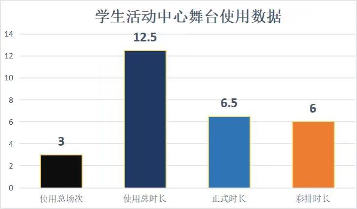 据统计,2023年3月大学生剧场管理团队共协助校园活动13场,其中学生活动中心舞台3场,户外活动10场,操场流动音响使用13次,活动总时长97.5小时(含彩排),团队成员最高值班时长为50.375小时。