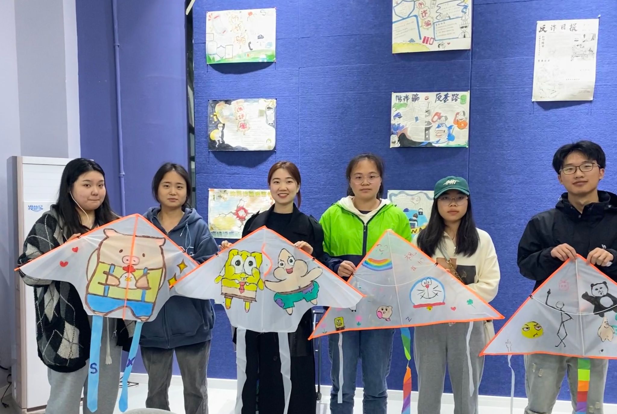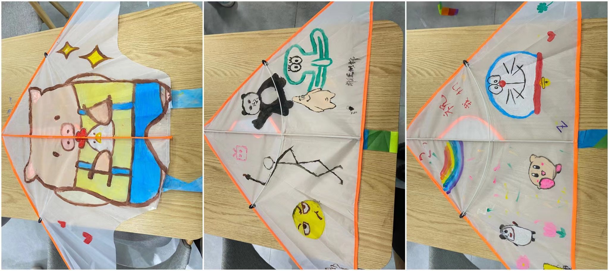 同学们把童年的回忆都画在了风筝上,有海绵宝宝,派大星,章鱼哥,哆啦A梦等多种可爱元素,当然也不缺一些搞怪的元素,所有的元素都被同学们通过自己的创新汇聚于风筝上。王陈老师也加入小组,和同学们一起绘画。