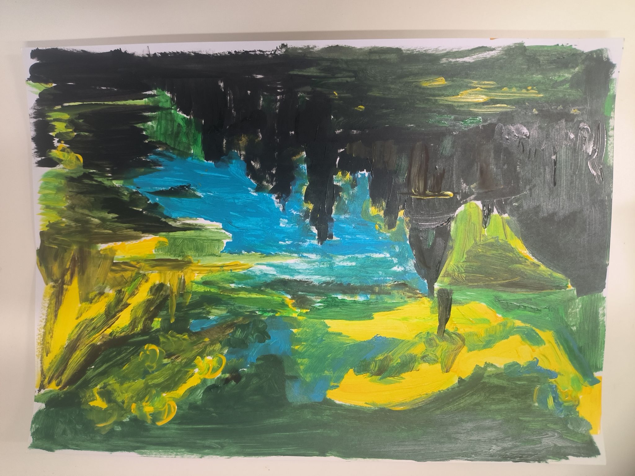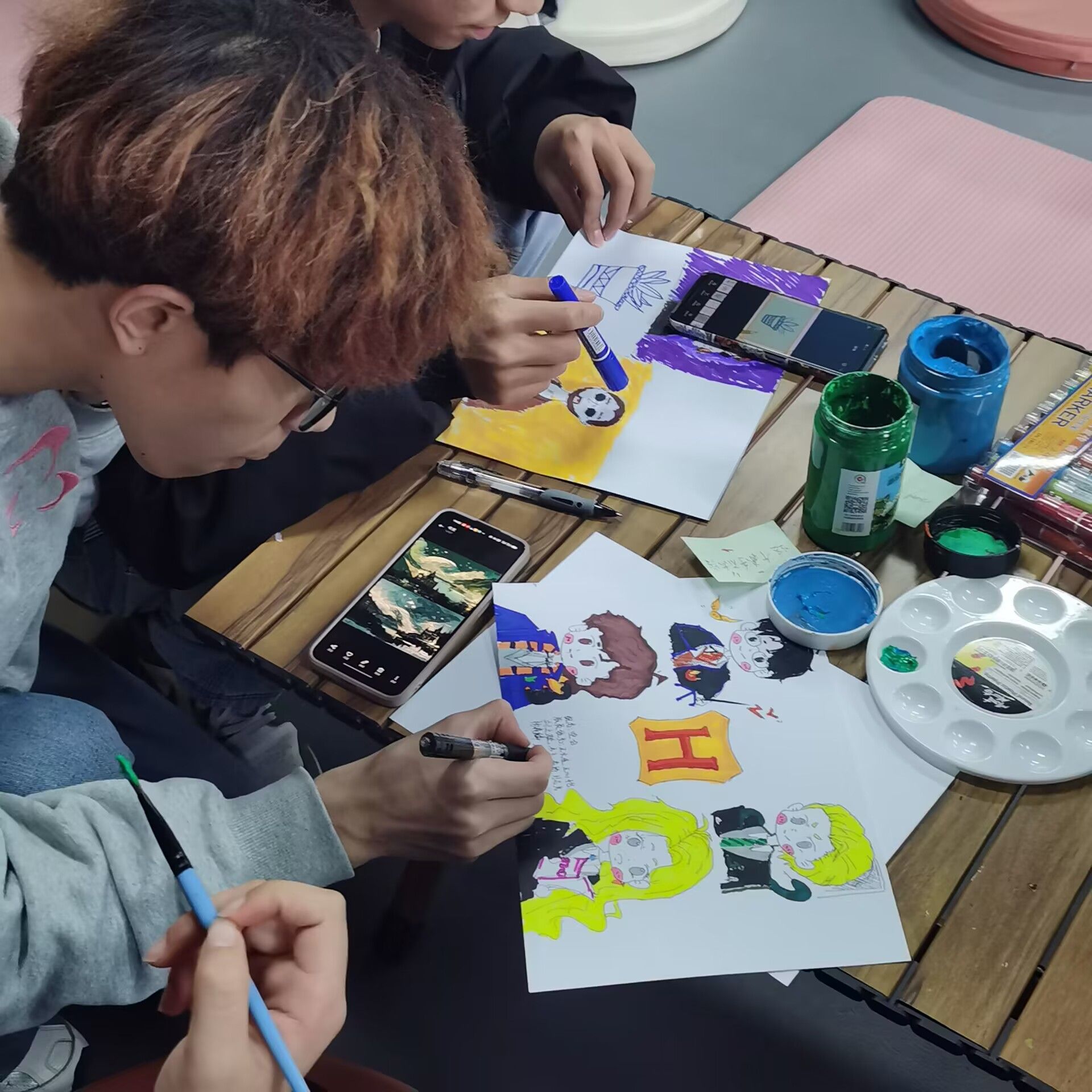 艺术是一座桥梁,将同学们对电影的热爱和生活的联系在一起。绘画组的同学根据抽取到的电影在原影片一帧又一帧美轮美奂的画面中选择自己心仪的、印象深刻的画面进行绘画创作,每一幅画作的诞生都不仅仅是因为震撼于电影的精美画面,而是观影者看到了自己。“一千个读者有一千个哈姆雷特”,由于人生经历的不同,画面给人带来的感受也不同。《哈利·波特》是著名的小说改魔幻电影,影片中有新奇的物种、令人心神向往的黑魔法、趣味横生的魔药课,也有骇人的怪物。王文佳小组拿到影片名后,就选择用“魔法”绘下哈利波特四人组,表达他们对主角间友谊的向往,即使面临巨大的困难,他们也能携手一起对抗。