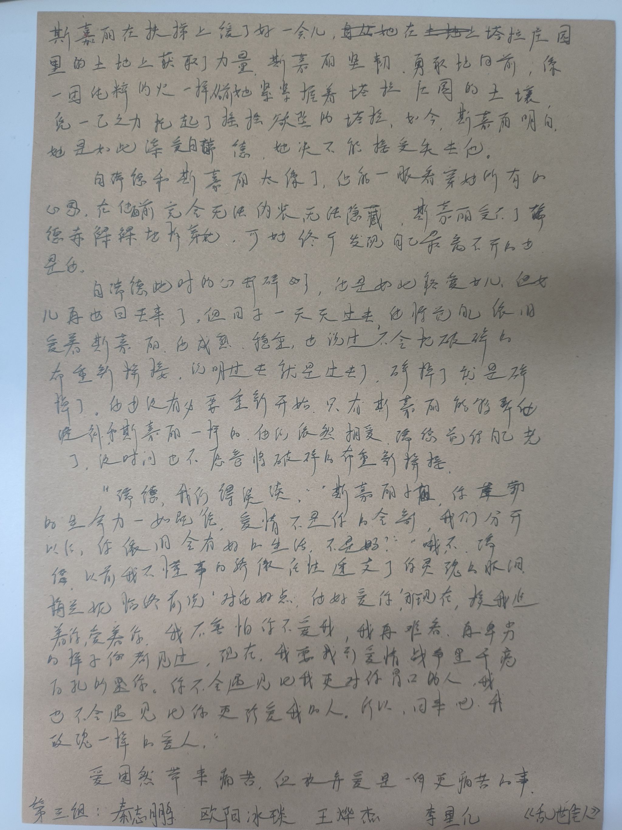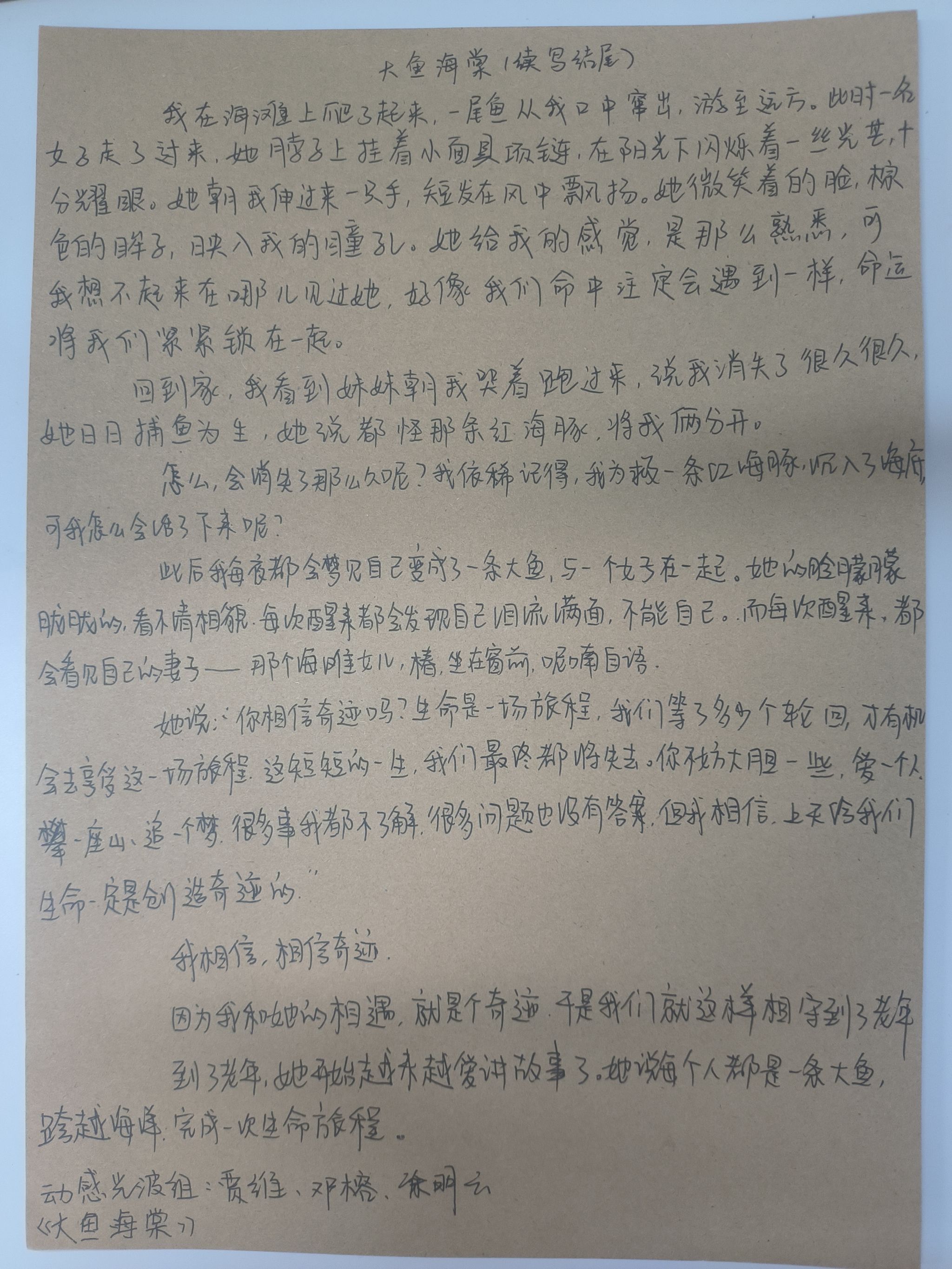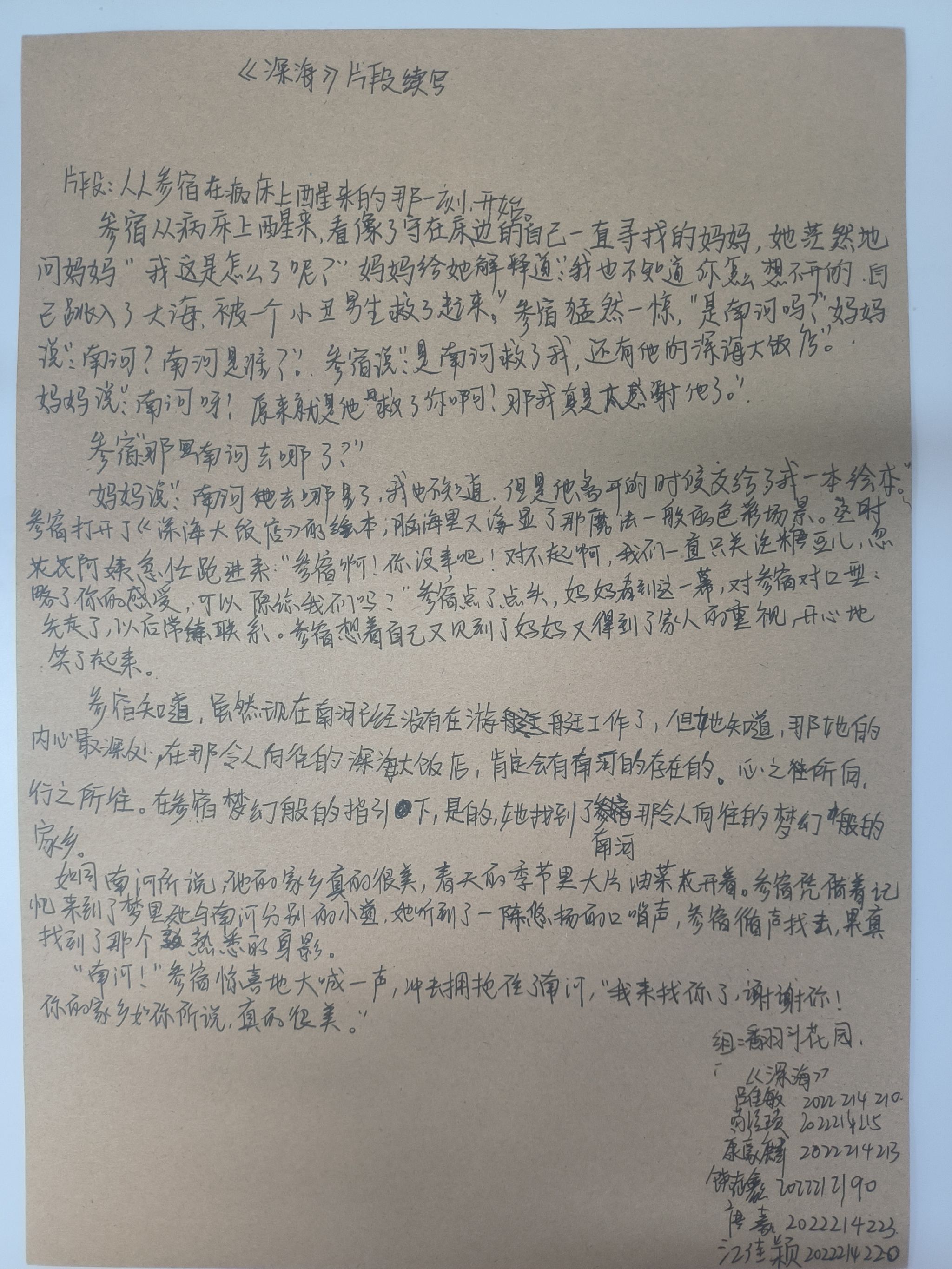写作组的同学也根据抽取到的电影尽情发挥想象力,协力合作,续写电影的结局或基于对电影情节的理解进行二次创作,用文字给心爱的角色一个希望“她”能拥有的结局。油皮纸上的一笔一划都是她们对美好的寄托,是她们给平行宇宙中的另一个自己创造出的避风港,也是对自己的希望和祝愿。吴润婕小组改写了《深海》的结局,把最珍贵的妈妈还给了参宿,吕佳敏小组则是把所有美好的东西都还给了参宿,妈妈的归来、南河的存活、爸爸和阿姨的醒悟,以及最后参宿与南河的重逢,两组同学都致敬了每一个行走在长夜里的人。世界上有太多“参宿”在等待着破茧而出,通过影片的映射,同学们也更能在感悟中发现自身的柔软之处,豁达待己,友善待他人。