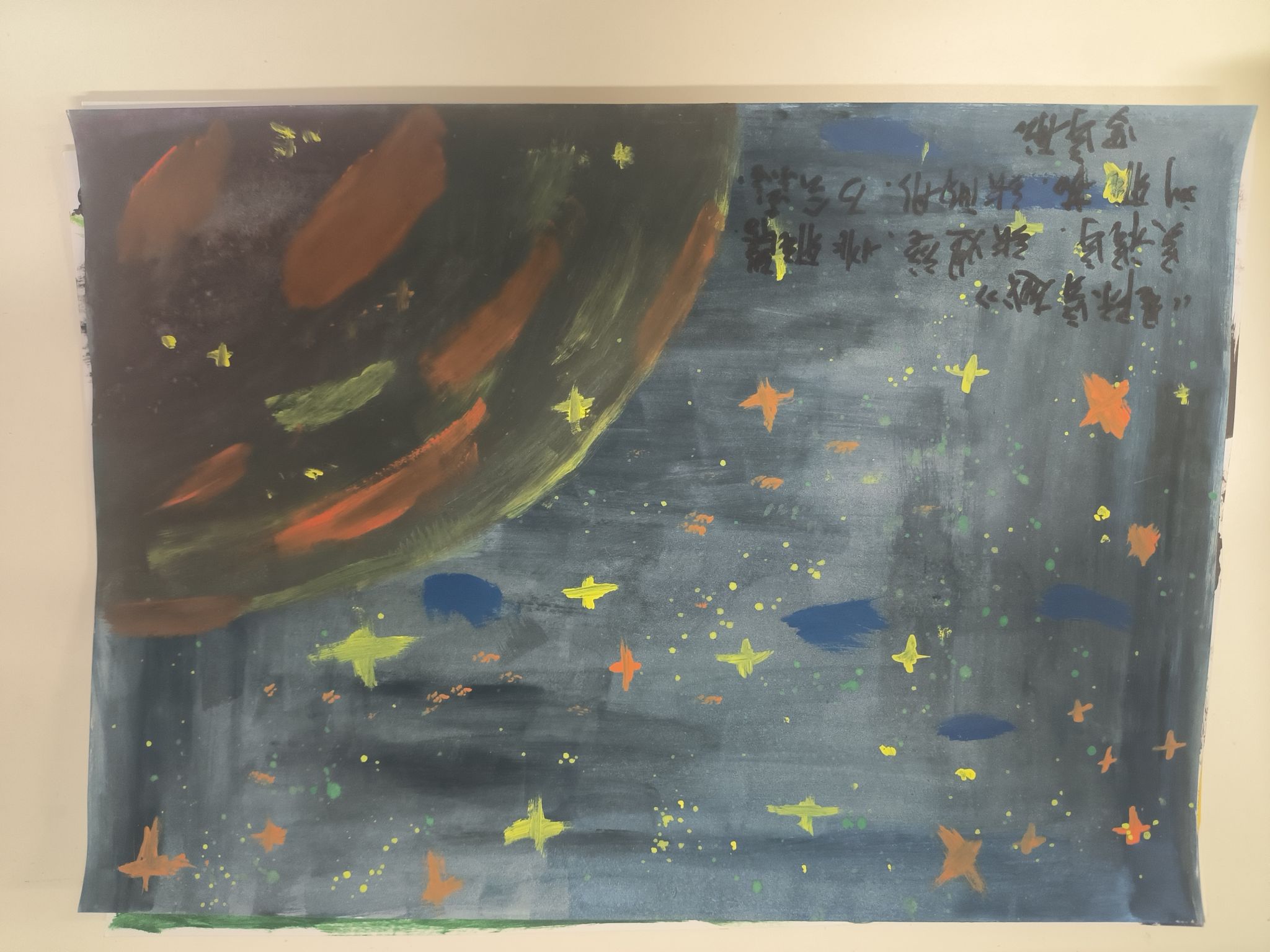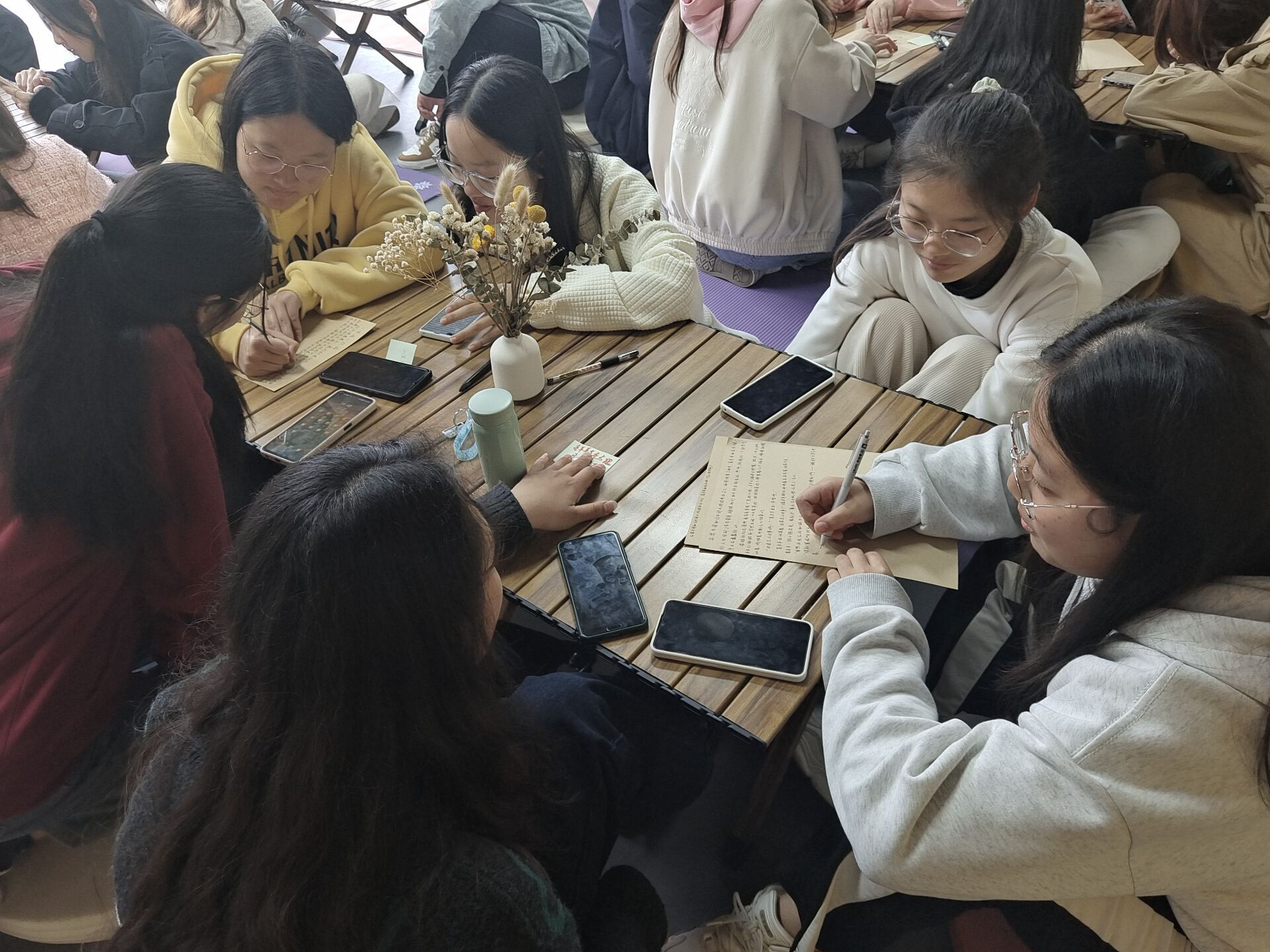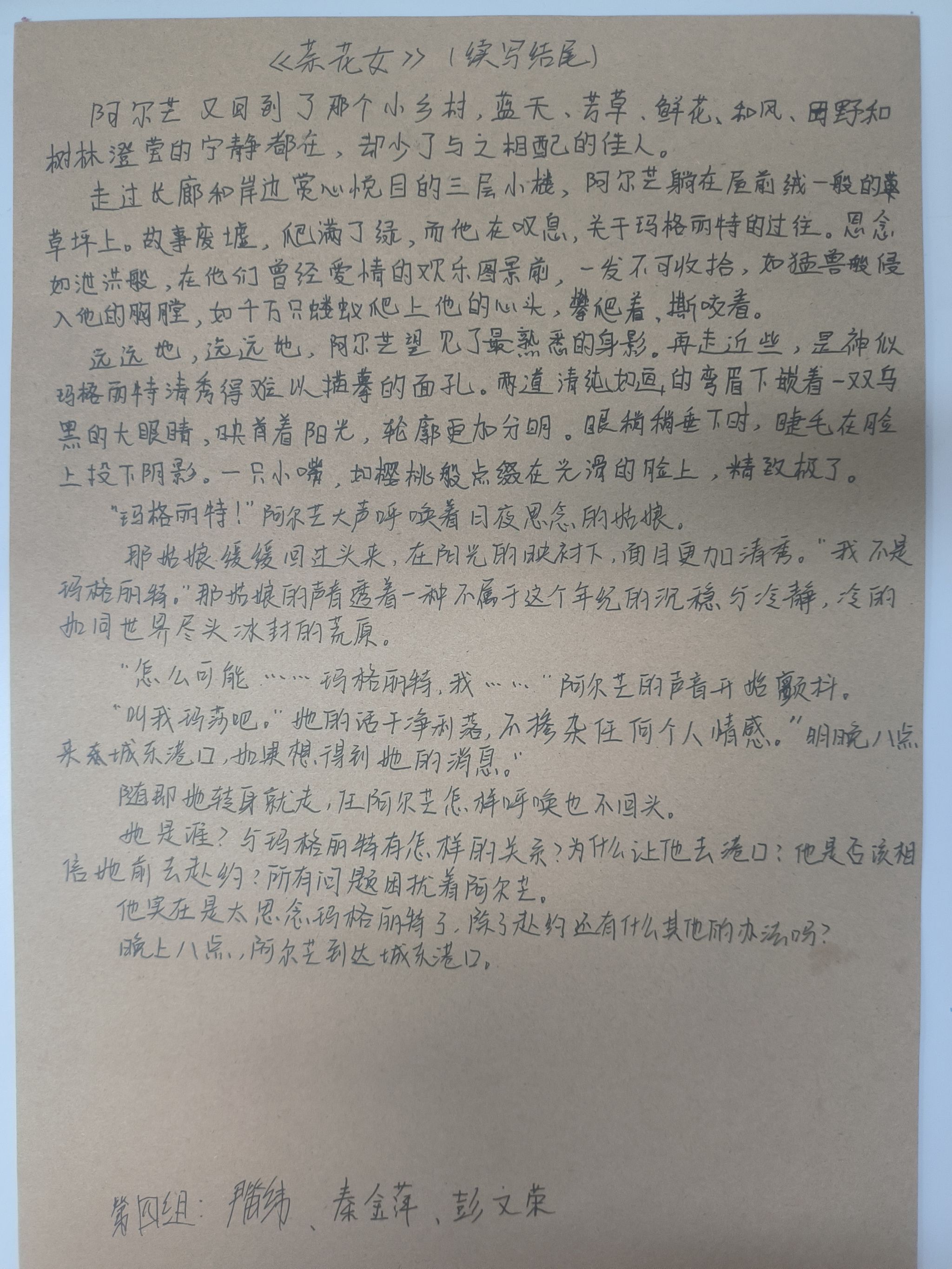 写作组的同学也根据抽取到的电影尽情发挥想象力,协力合作,续写电影的结局或基于对电影情节的理解进行二次创作,用文字给心爱的角色一个希望“她”能拥有的结局。油皮纸上的一笔一划都是她们对美好的寄托,是她们给平行宇宙中的另一个自己创造出的避风港,也是对自己的希望和祝愿。吴润婕小组改写了《深海》的结局,把最珍贵的妈妈还给了参宿,吕佳敏小组则是把所有美好的东西都还给了参宿,妈妈的归来、南河的存活、爸爸和阿姨的醒悟,以及最后参宿与南河的重逢,两组同学都致敬了每一个行走在长夜里的人。世界上有太多“参宿”在等待着破茧而出,通过影片的映射,同学们也更能在感悟中发现自身的柔软之处,豁达待己,友善待他人。