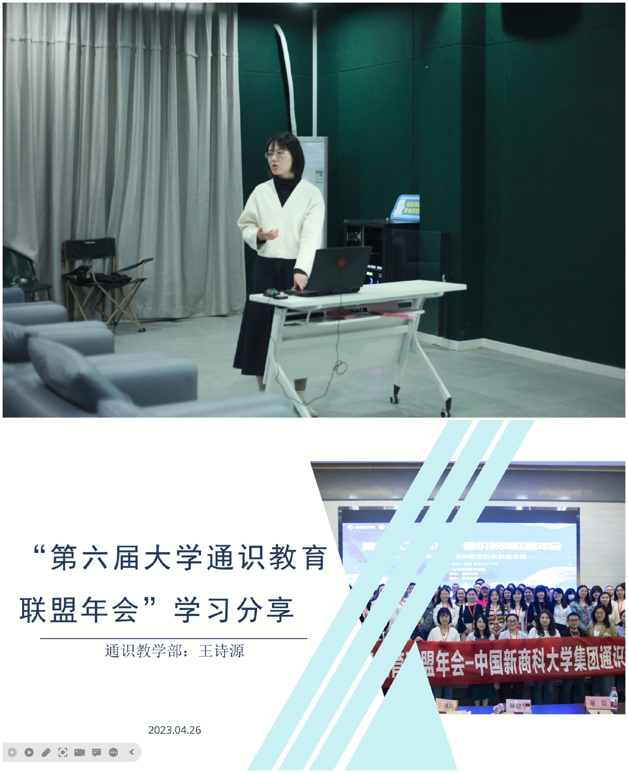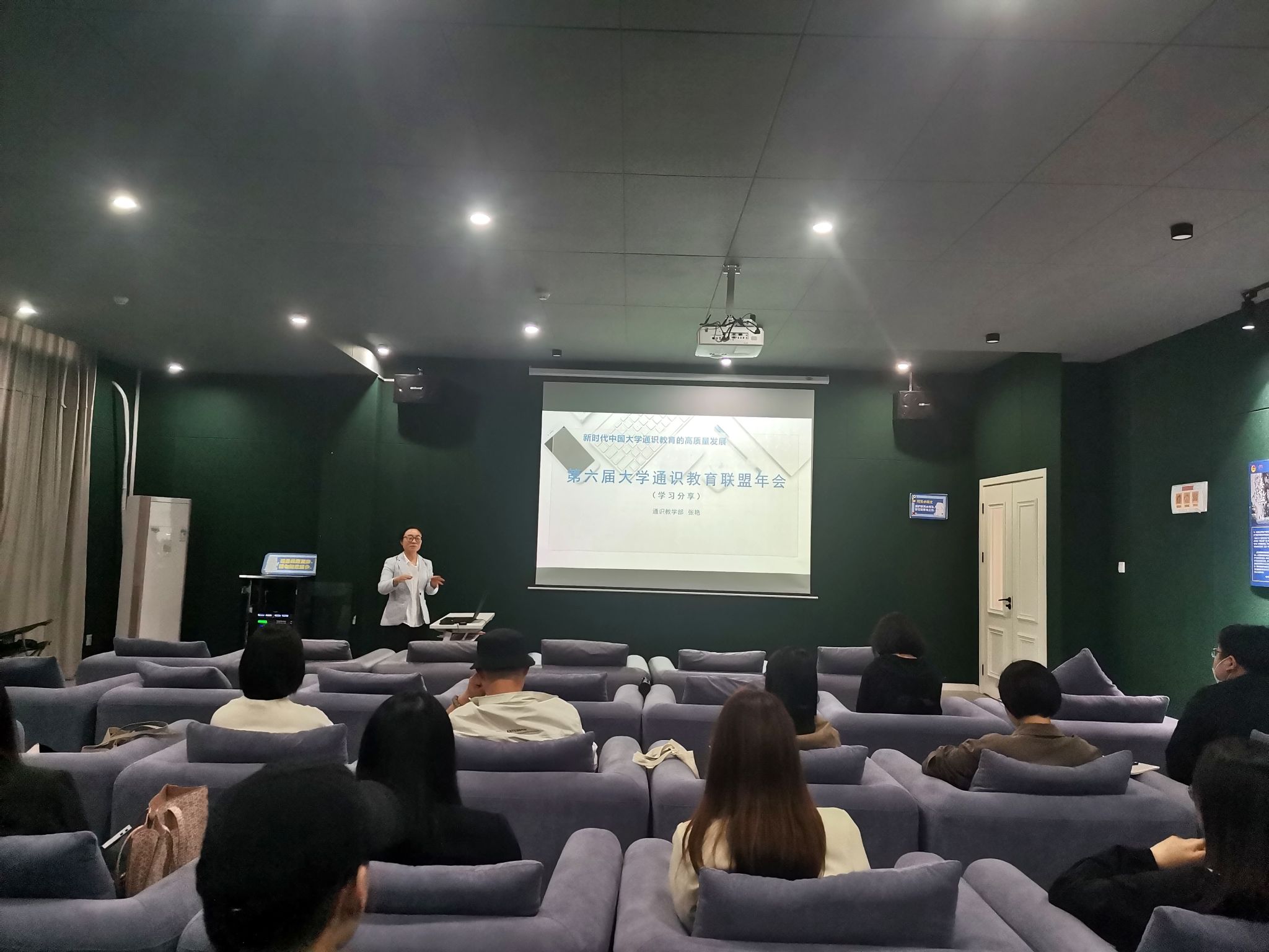 随后,王诗源老师借用大学通识教育联盟秘书长、清华大学通识教育委员会主任甘阳教授的一句话开始分享年会学习内容。甘阳教授说:我们需要坚定通识教育核心不动摇,努力迈向五育并举、通专融合。王诗源老师非常赞同甘阳教授的观点,并结合学习情况进行分享。王诗源老师还分享了重庆大学、复旦大学、武汉大学都重视经典阅读,实行大班授课,小班研讨,这种模式为我们通识课程提供了发展思路,研讨是通识课必不可少的环节。